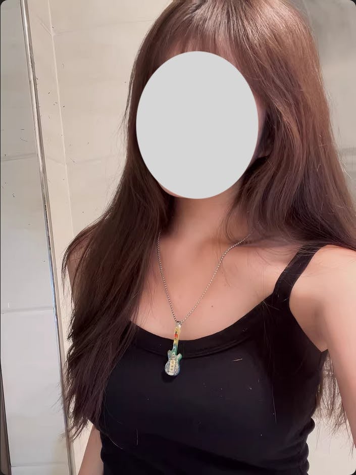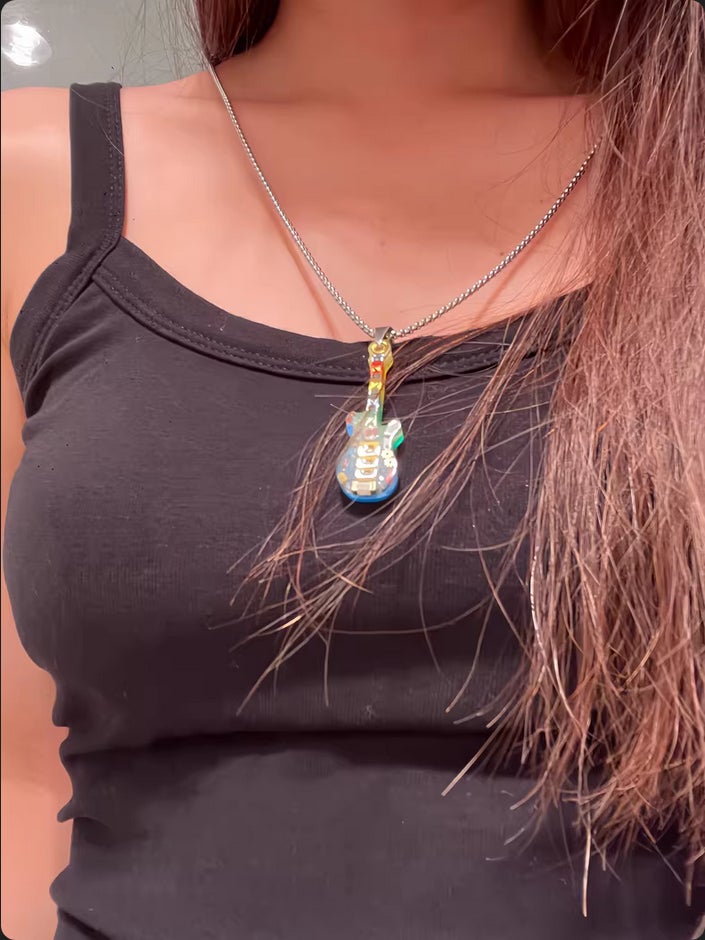 私の顔は見えないけど、このギターペンダントの美しさは全開!あなたもこのペンダントを身につけたら、きっと視線を独り占めすること間違いなし!