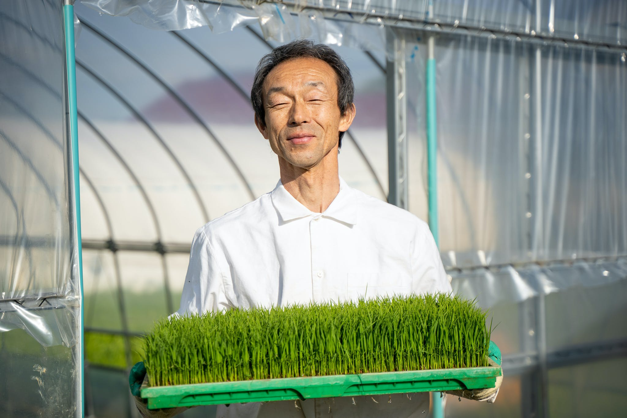 田植え前の稲 芽が大きくなるまでハウスで育てます