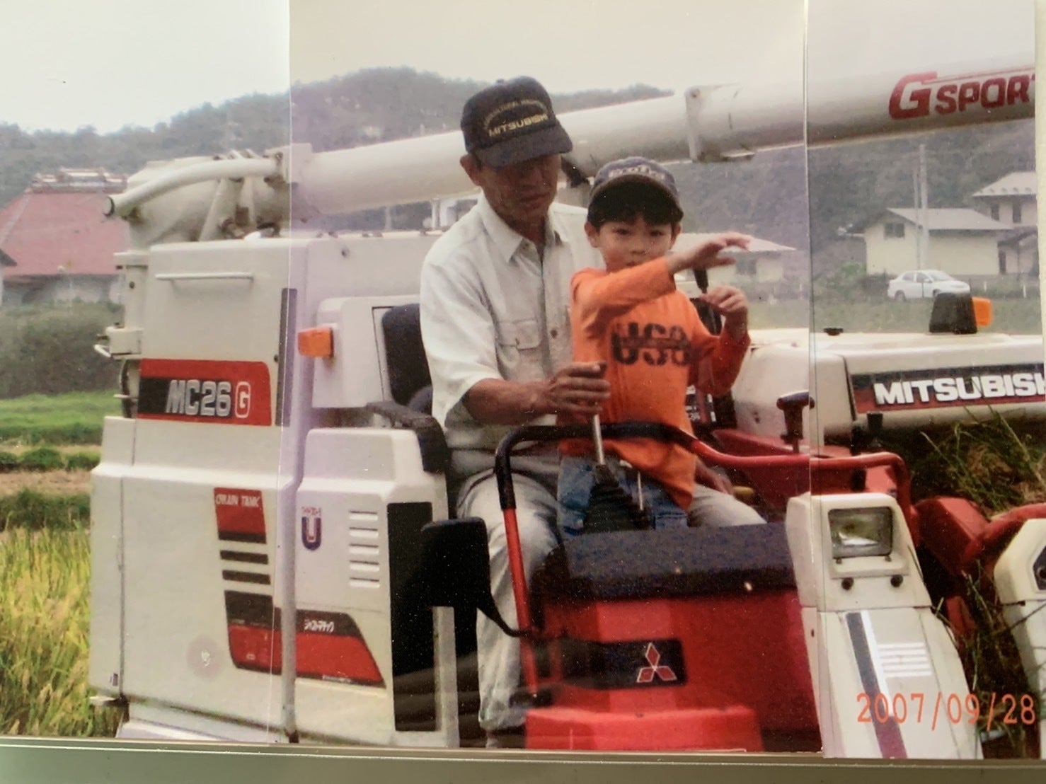 コンバインに乗る幼少期の佑太少年と祖父武一