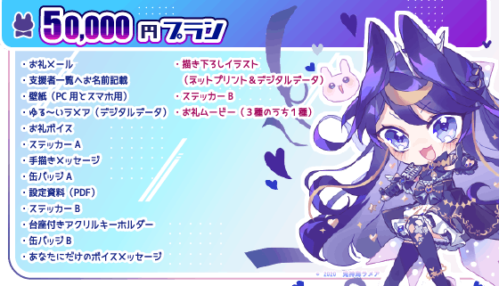 ※『あなただけのボイス』『あなただけのお礼ムービー』以外につきましてのグッズの内容、メッセージの内容等は全支援者共通となっております。