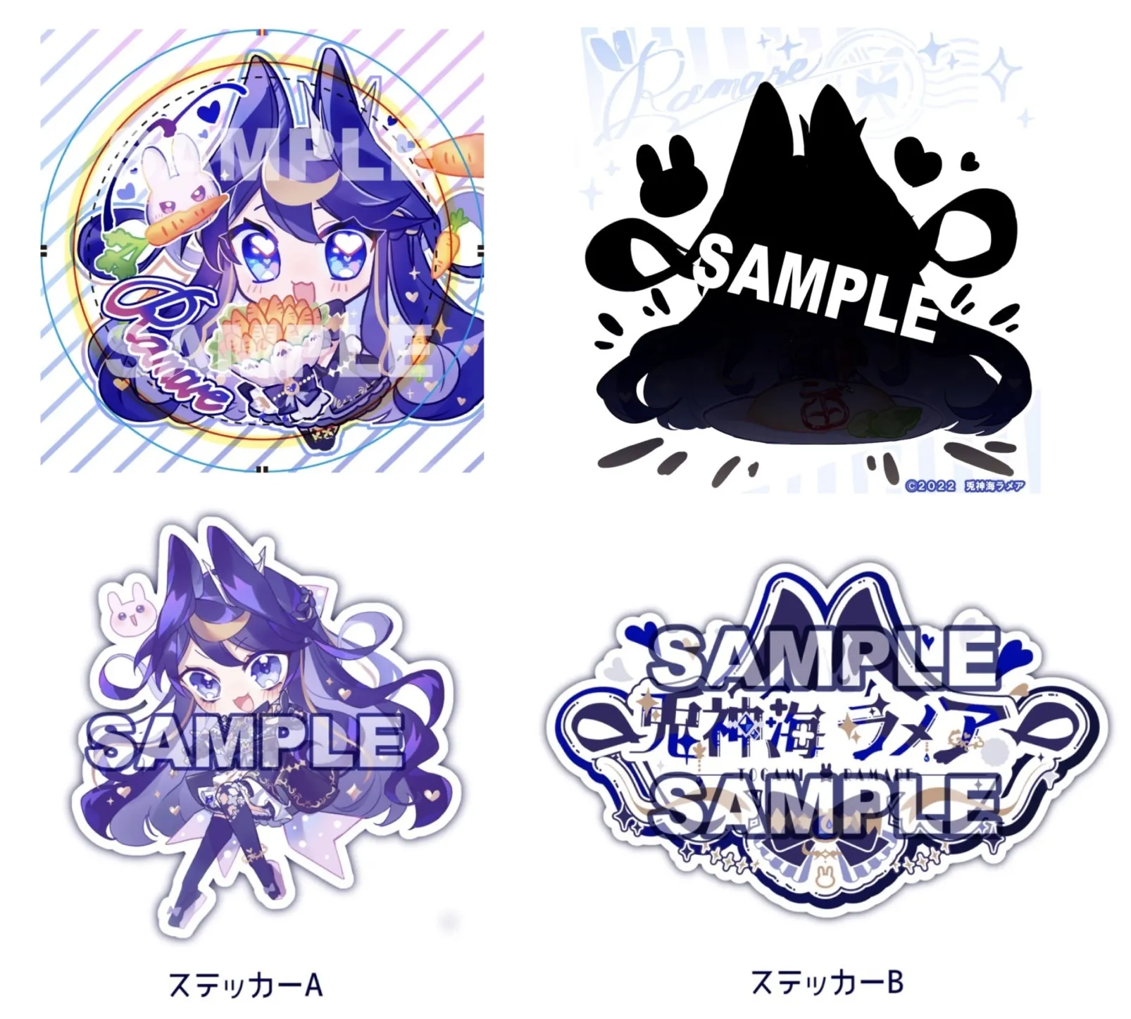 缶バッジA、ステッカーA、ステッカーB、ゆる〜いラメアのサンプル画像を更新しました!