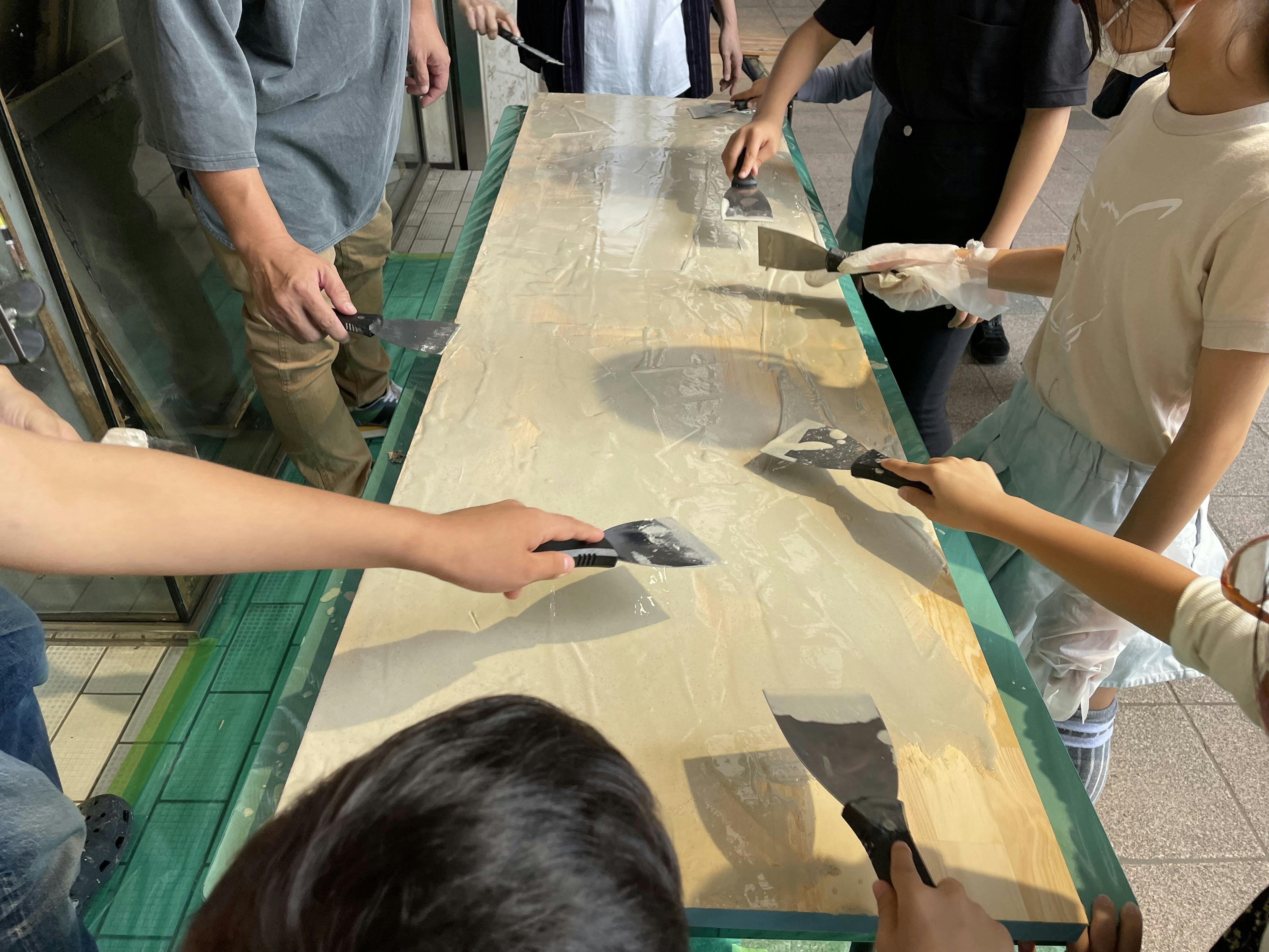その塗料を今回は机とコースターに塗ってみることを体験しました。