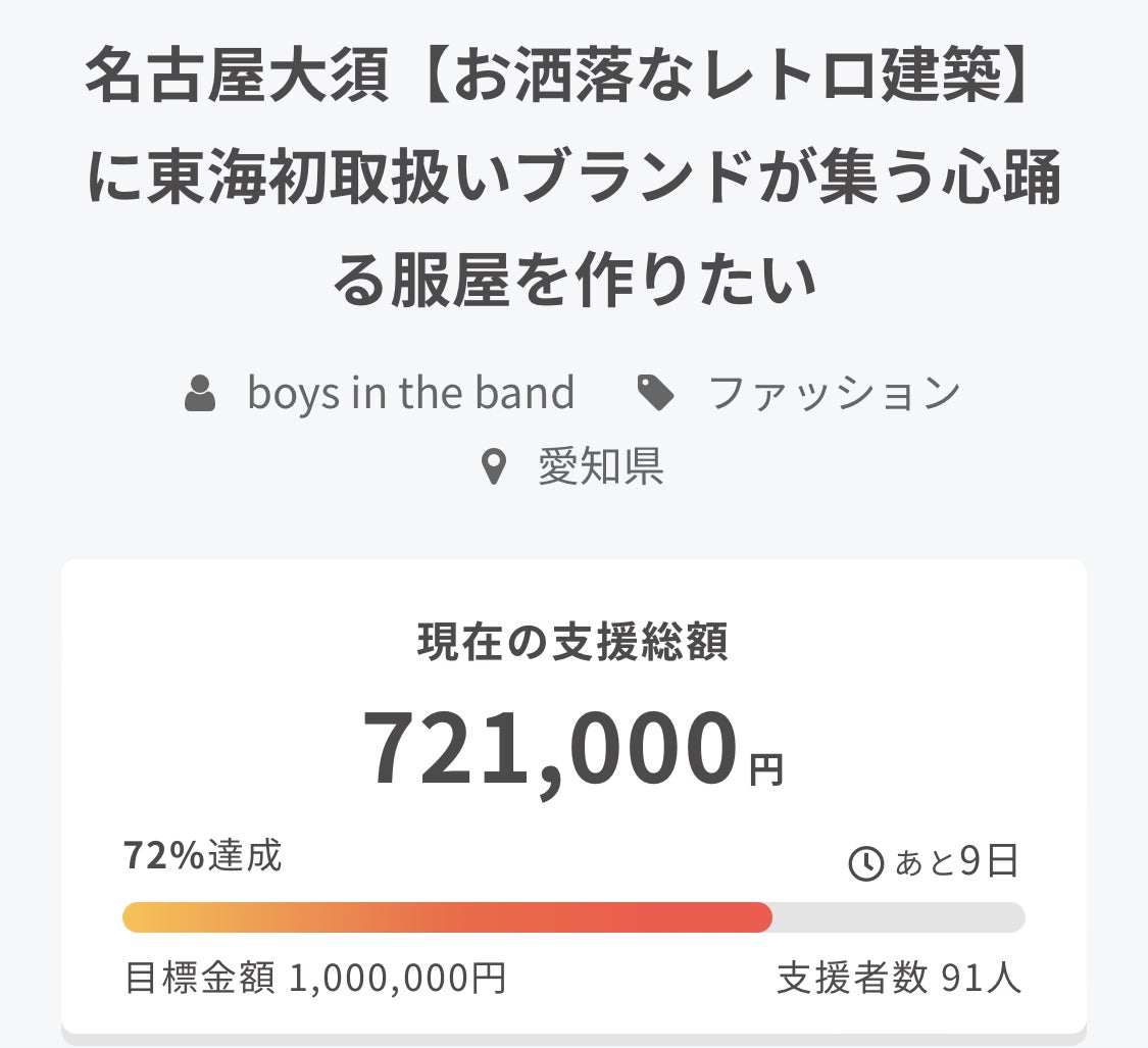 「名古屋大須【お洒落なレトロ建築】に東海初取扱いブランドが集う心踊る服屋を作りたい」プロジェクト達成しました‼ご支援いただいた皆様、ご協力くださったお店の皆様、心より感謝申し上げます。そして本日10/16(日)boys in the band OSUともしび をオープンしました‼新進気鋭な名古屋そして東海地方初のブランドがたくさん並んでおります♪店内の世界観もすごく良い仕上がりになっておりますので是非とも見ていただきたいです!そしてオープン記念にお祝いを沢山いただきました。他にも沢山いただきました!祝福してくださり本当にありがとうございます。いよいよこれからお店としてのスタートをきりました。全員でいいお店になるよう頑張りますので是非とも遊びに来てください!引き続き応援のほどよろしくお願いいたします。