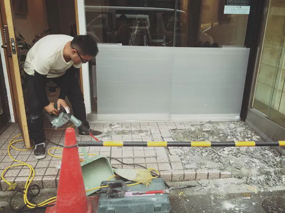 6/30&7/1は、ゲストハウスを全面クローズして、エントランスのモルタル工事を行いました。