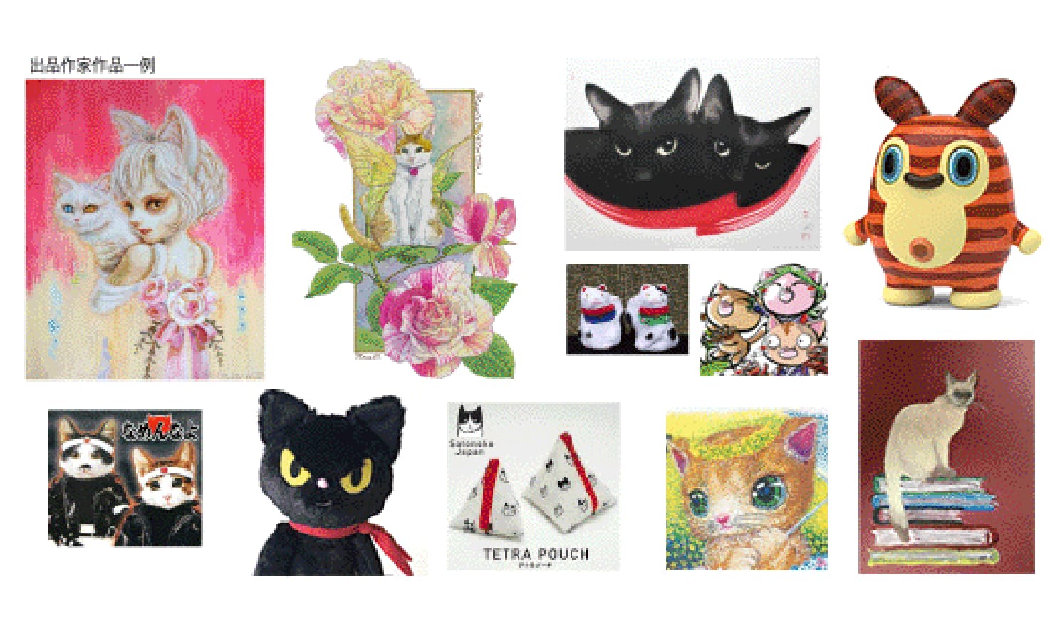 ★出 品 者:土屋伸之(ナイツ・タレント)・吉井宏(キャラクター作家)・中島祥子(猫妖精画家)・小林東雲(映画『線は、僕を描く』の水墨画監修)・ 高橋行雄(猫の絵描き)・ミルヨウコ(幻想画家)・鶴田能史(ファッションデザイナー)・岸田尚(画家)・金澤麻由子(童画家)・中村景児(童画家)・南幅俊輔(猫写真家・猫グッズクリエーター)・増山玲奈(映画監督・画家)・魅上満(歌手・イラストレーター)・黒猫クロッチ(猫キャラクター)・なめ猫(猫キャラクター)・いがらしゆみこ美術館・招き猫美術館・一宮張り子・他多数の人気のかわいいアート作家・猫アート作家・若手含む応募猫作家 合計約80人以上。