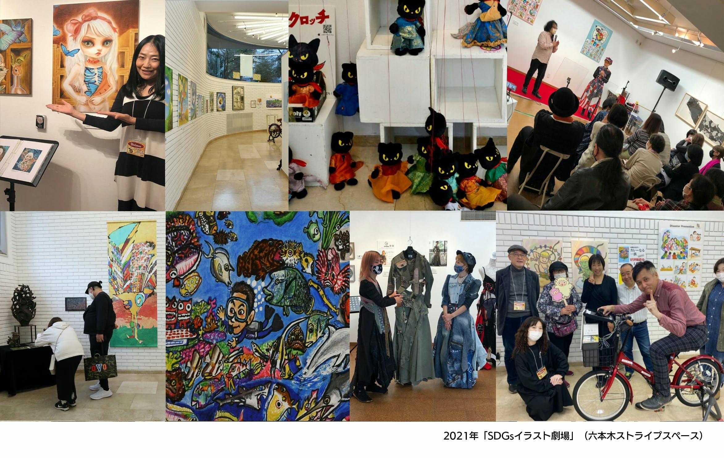 2021年11月に開催した「SDGsイラスト劇場」(六本木ストライプスペース)は、アート展にミニステージを設置した、ユニークなアート展でした。50人の絵師はSDGsのご自分の選んだ項目についての視点や考え方も表現も、仰天するほど多種多様。さかなくんも「海を守ろう」の絵を出品されました大好評のアート展でした。