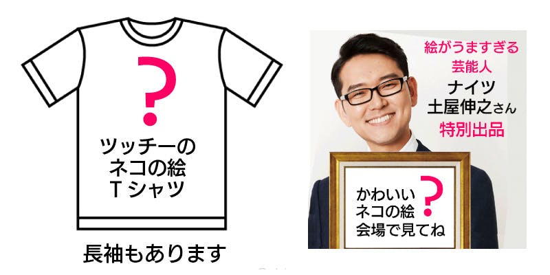 絵がうますぎる芸能人「ナイツのツッチーの、本邦初公開の猫の絵Tシャツ(限定品)」1枚+画集1冊+お礼のお手紙、を配送でお届けします(1月中)。お得となっています。