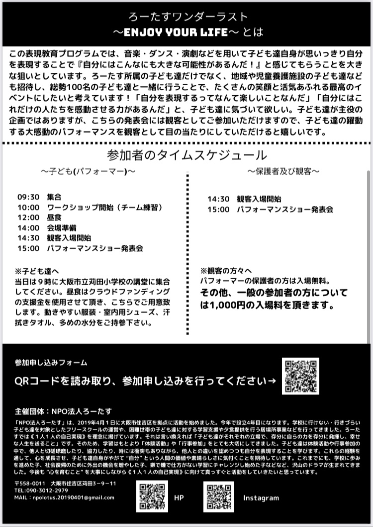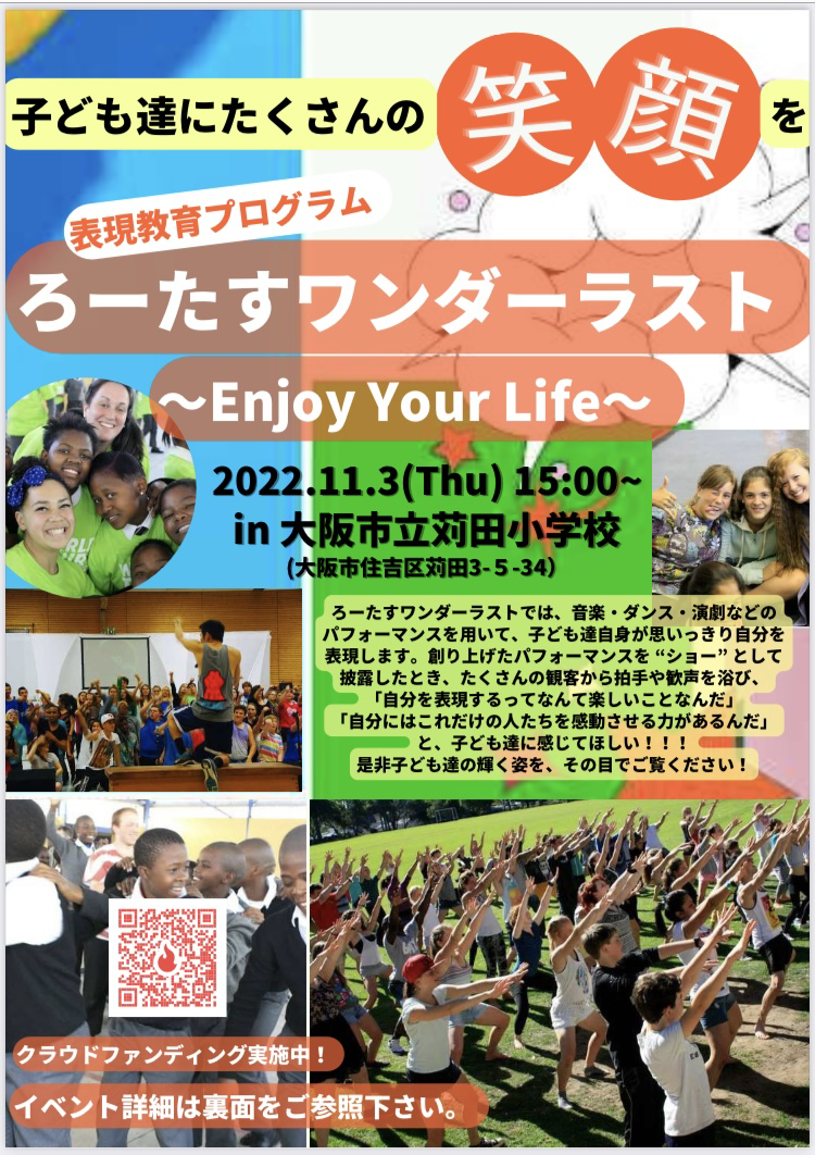大阪の子ども達にたくさんの笑顔を届けるために、表現教育プログラム『ろーたすワンダーラスト!~Enjoy Your Life~』の実施にお力を貸していただけませんでしょうか?