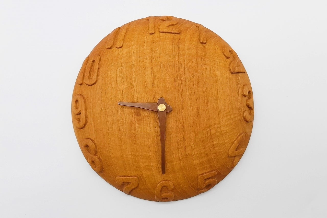 ポコポコと立体的な数字が美しい掛け時計。 1枚の板からすべての数字を削り出しました。