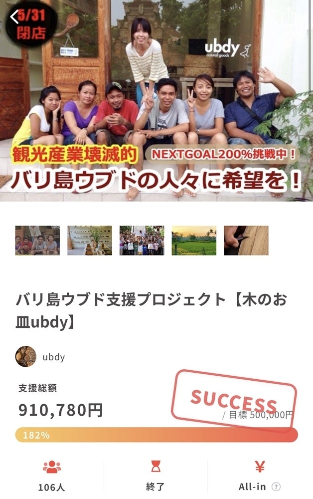 ウブド店再建のためご支援のほど何卒宜しくお願いいたします。