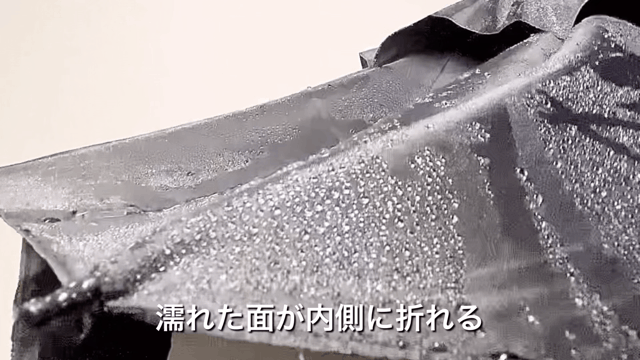 【GYAKUSOL】最大の特徴の一つが、逆折り畳み仕様です。従来の折り畳み傘は雨が濡れた面が折り畳み時、外側に来るのに対し【GYAKUSOL】は濡れた面が内側に来るように折りたたまれます。