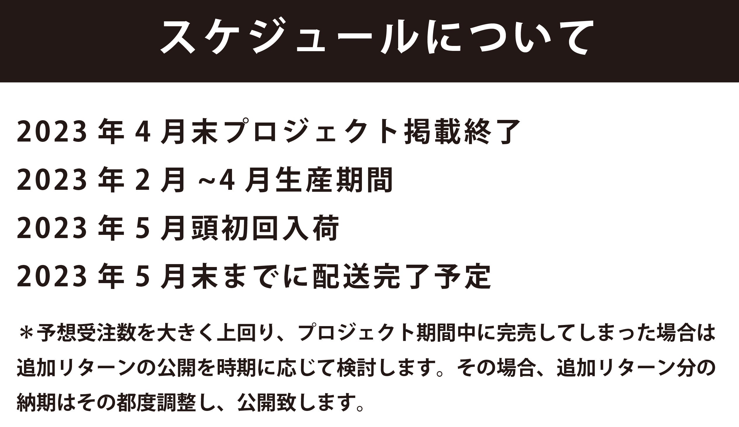 ※生産納期については、余裕を持って進めてまいりますが、コロナウイルスの感染拡大などの影響で生産や物流に遅延が出る場合があります。その際には活動報告にて随時報告させて頂きます。予めご了承ください。 ※ 本文中に記載させていただいたスケジュールは、あくまでプロジェクト公開時点の予定です。受注生産の性質上、配送遅延のおそれがございます。 原則として、配送遅延に伴うご支援のキャンセルはできませんが、リターン配送予定月から3ヶ月を超えた場合には、希望者に限りキャンセルにて対応させていただきます。 製造スケジュールについては、現在プロジェクト成功を想定した数で調整しておりますが、 ご支援数が想定を上回った場合、製造工程上の都合や配送作業に伴う止むを得ない事情により、お届けが遅れる場合がございます。 上記のようにプロジェクト本文に記載している内容に変更がある場合は、できるだけ早く活動報告などで共有を行っていく予定です。 ※一部国内に類似商品が出回っている場合がございます。弊社では他社の類似品に関してのお問い合わせには対応できませんのでご了承ください。