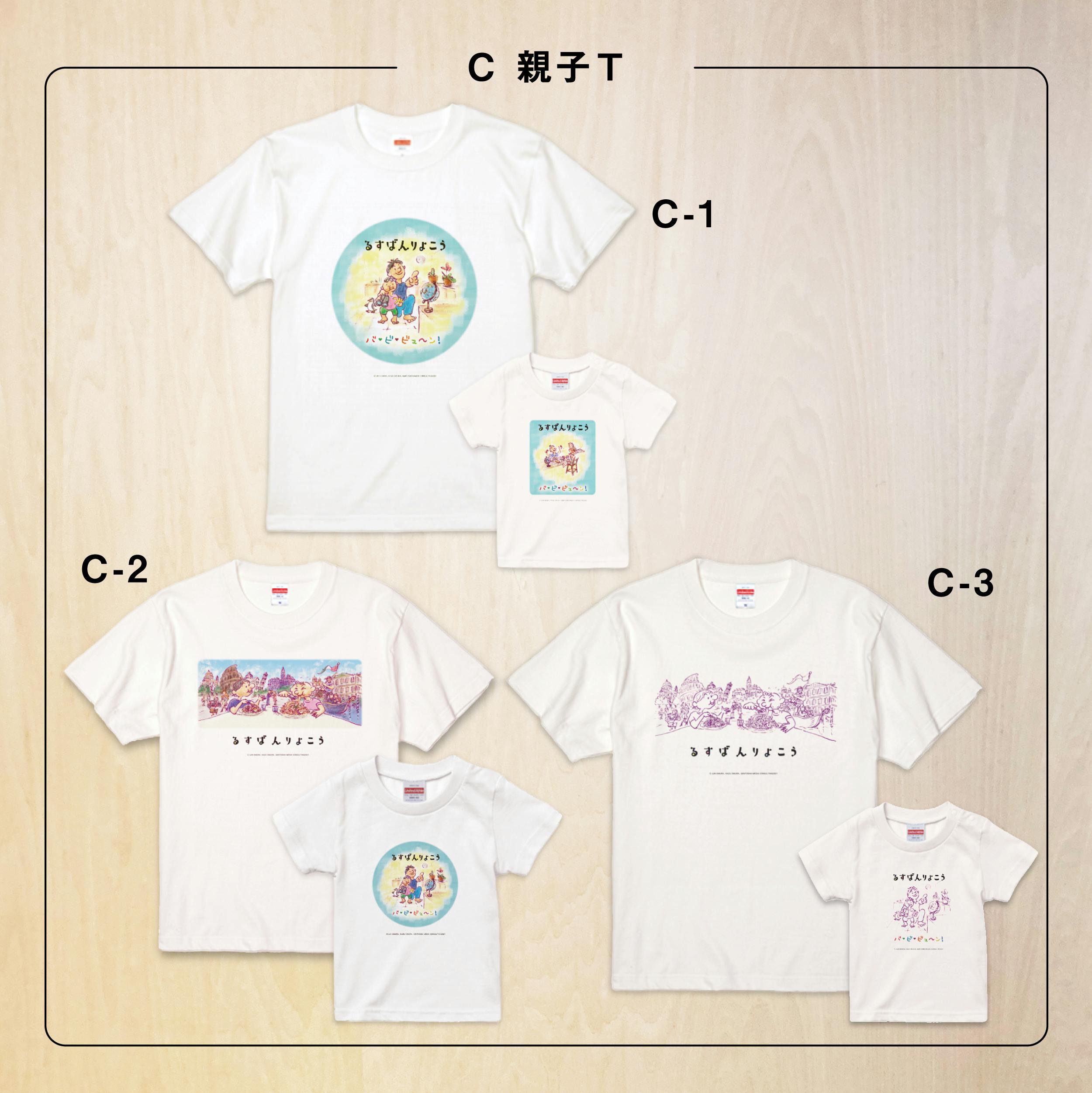 ・親子T:親子で好きな絵柄が選べる。大1点(Mends or Ladys)、小1点(Kids or Baby)をセットで!(以下3種の組合せから選んでください)C-1、C-2、C-3