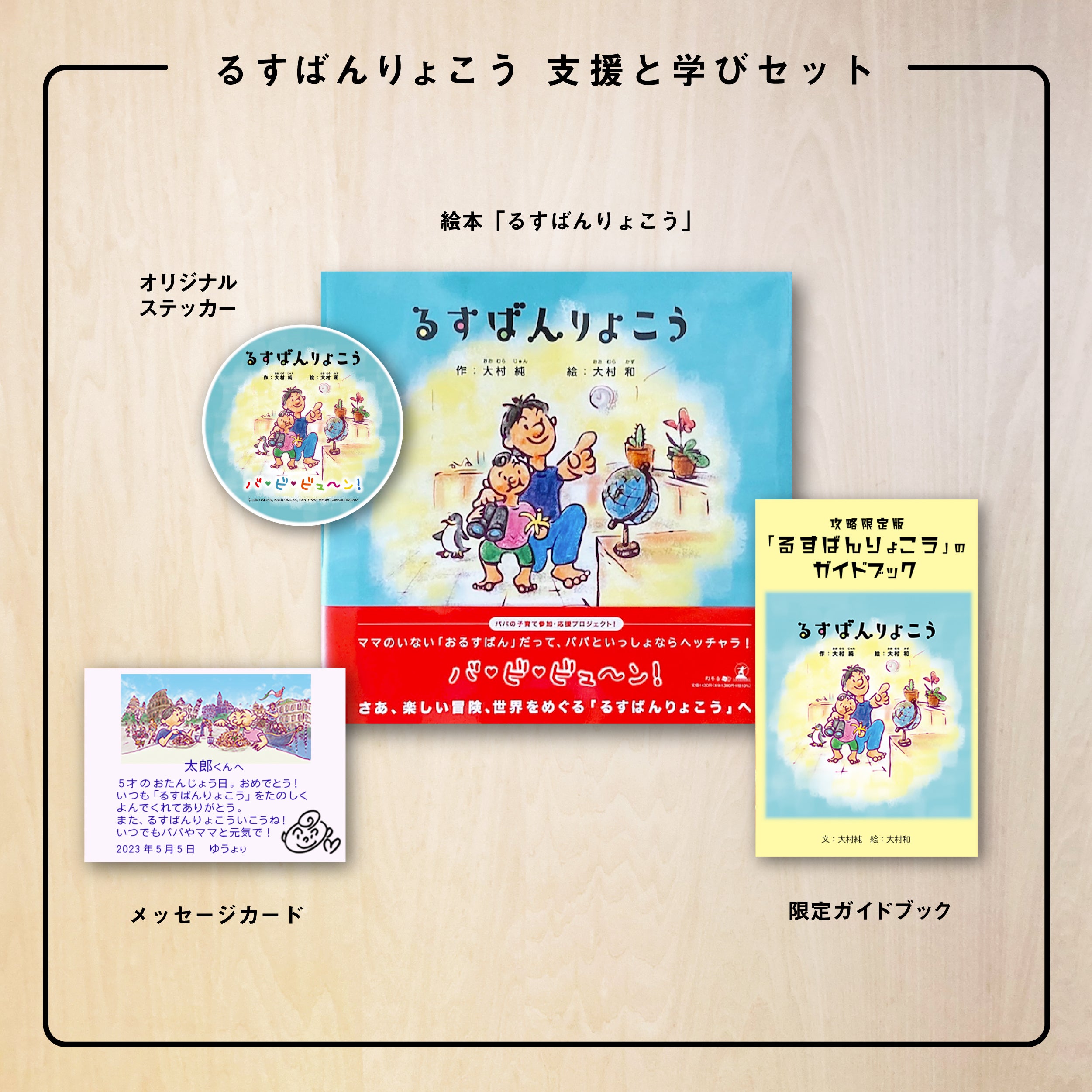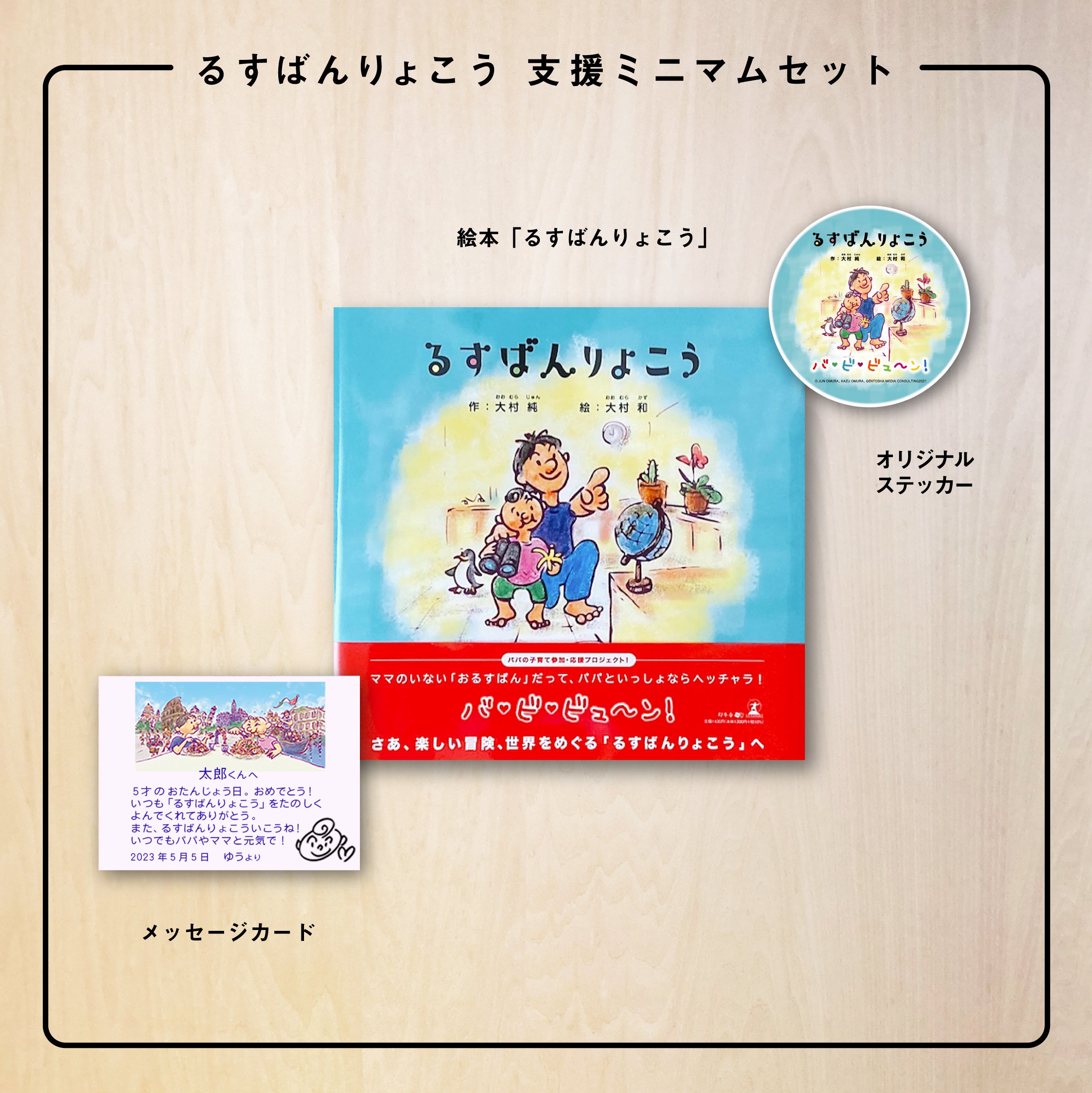 ・絵本「るすばんりょこう」 ・メッセージカード ・オリジナルステッカー