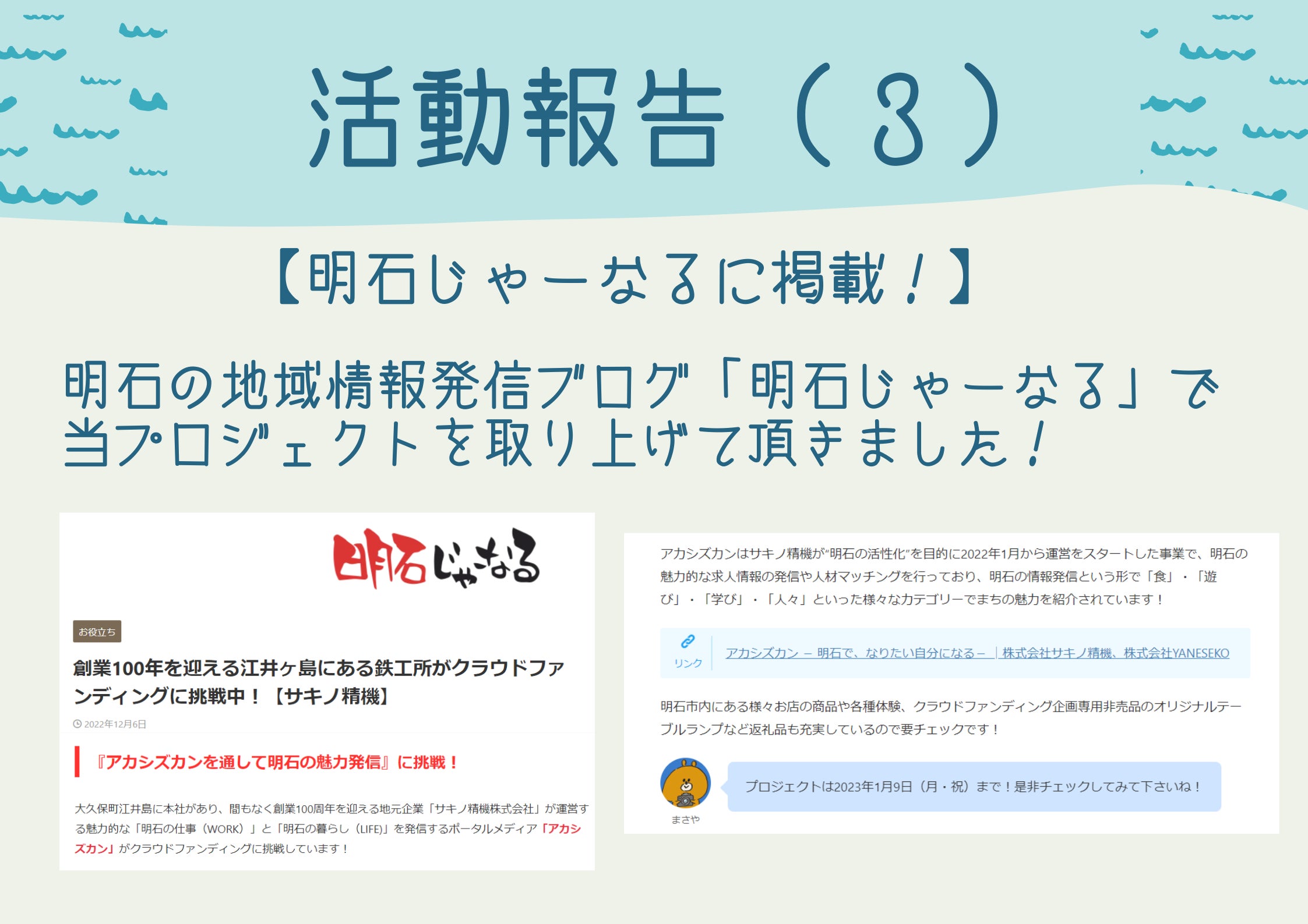 明石の地域情報発信ブログ「明石じゃーなる」で当プロジェクトを取り上げていただきました!