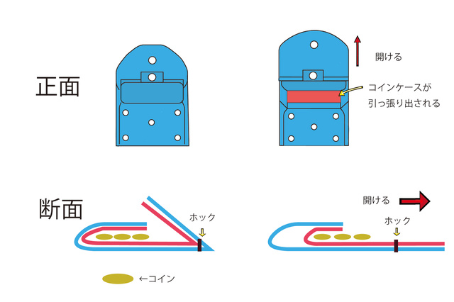 一番難しかったのは外側のフラップを開けたときにスムーズにコインの収納部分が出てくるようになる設計です。