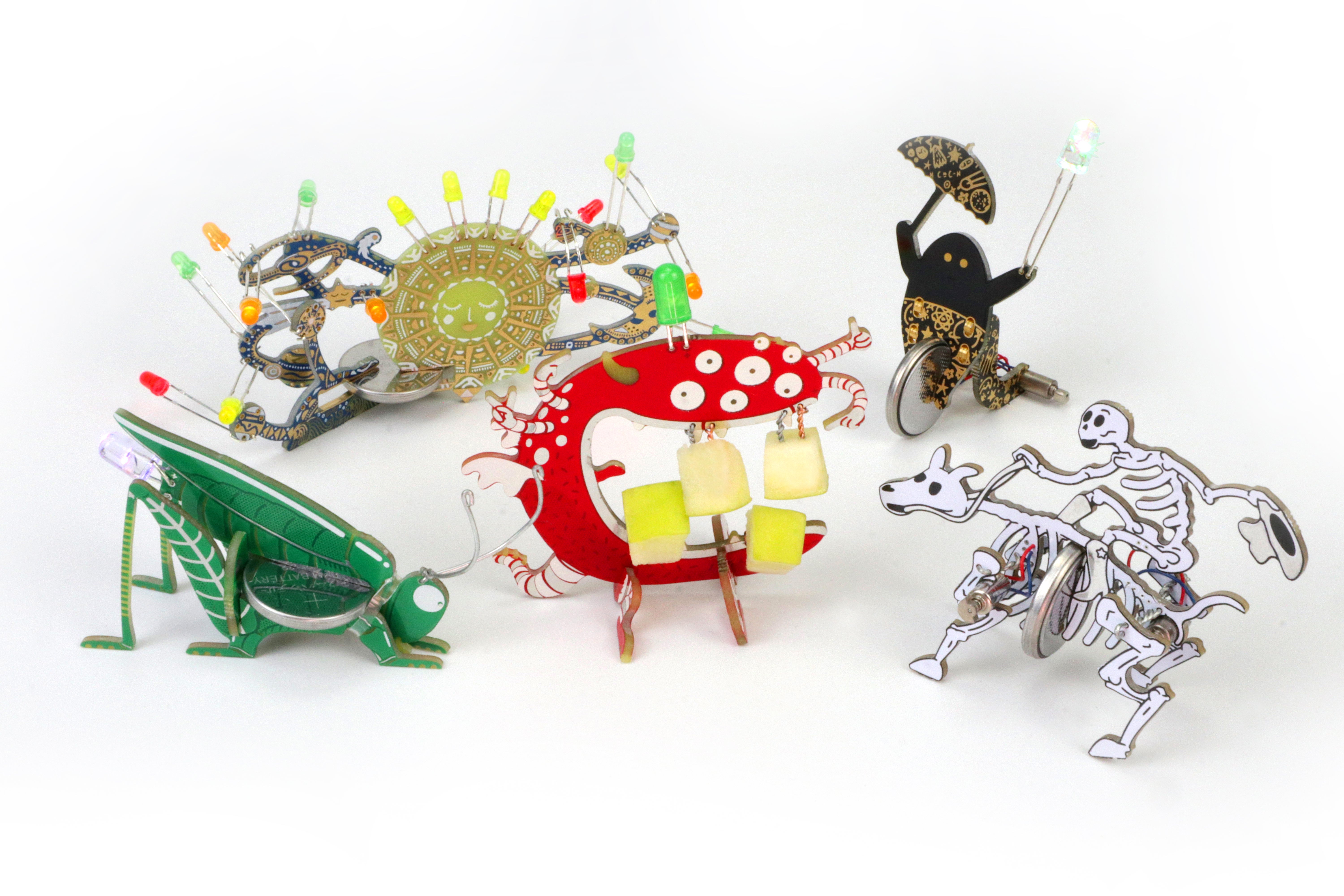 完成したロボットたちはボタン電池を動力にして、ピカピカ光ってかわいいしぐさをしてくれます。