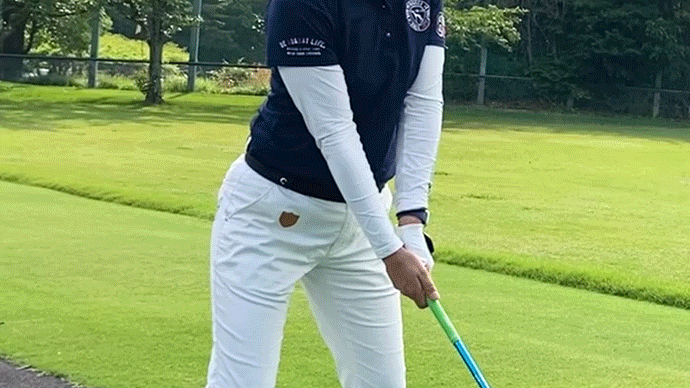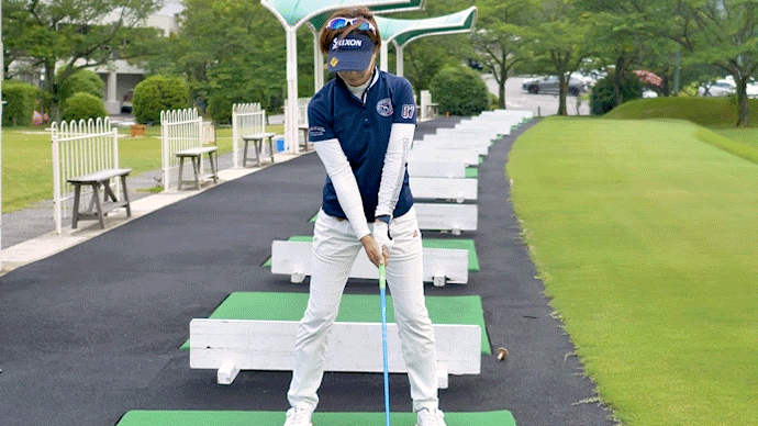 それにより腰の軸の崩れを防ぎ、頭の位置・前傾姿勢を安定させることで良いボールが飛ぶようになります。