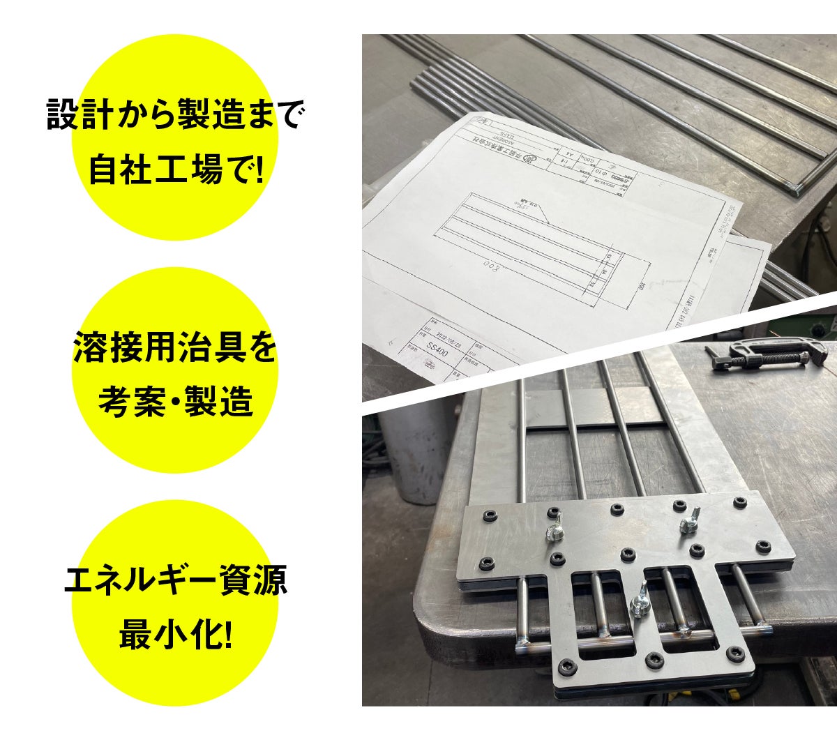原材料ロスを極力なくし作業効率を高めるため、溶接用治具を考案・製造することで、CO2排出や電力使用量などのエネルギー資源最小化にも取り組んでいます。