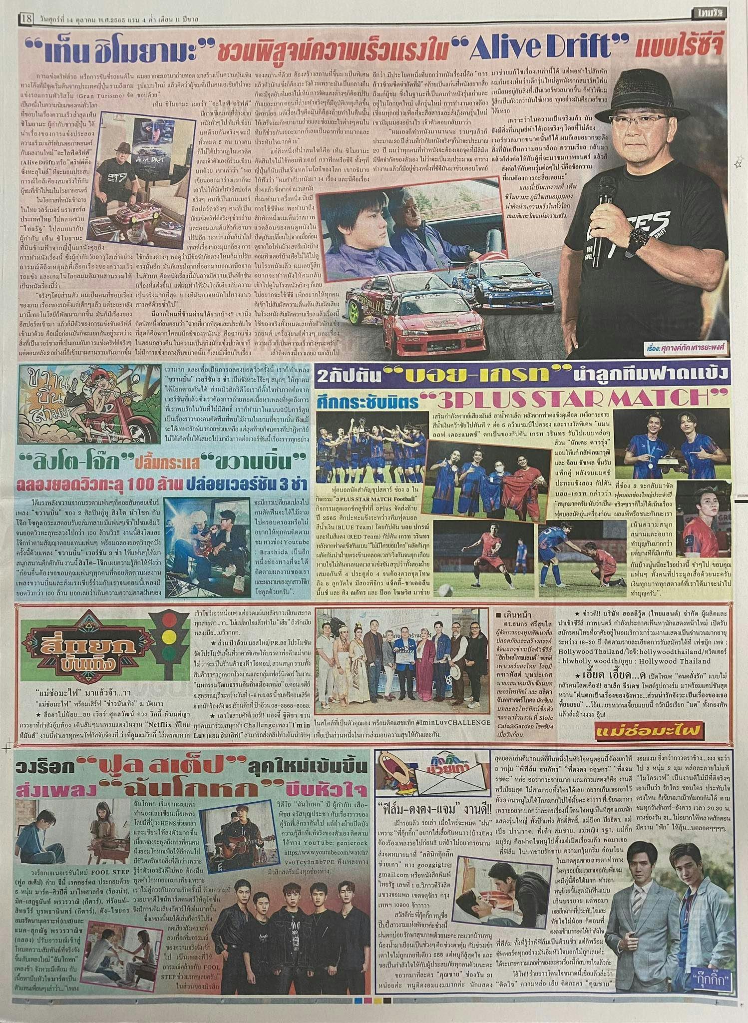 2022/10/15 12:57映画『ALIVEHOON アライブフーン』海外公開記念プロジェクトにご支援&ご協力くださっている皆様10月6日(木)、タイに下山監督が取材&試写会に登場しました!本プロジェクトの成功により、下山監督が無事に海外に訪問をすることが叶いました。改めて皆様に心より感謝申しあげます。タイ配給のワーナー・ブラザーズ様により、10月6日(木)の午前から午後まで新聞、TVなどの取材をみっちり組んでいただきました。取材の内容を一部お伝え致します。タイで最も影響力がある新聞社の一つのタイラットという新聞社に記事にしていただきました。▼タイラット記事▼https://www.thairath.co.th/entertain/movie/2526200タイで有名なコメンテーター&ワーナー・ブラザーズのゼネラルマネージャーでもあるヘンリーさんのYoutube番組です。▼ヘンリーさんYoutube番組▼https://www.thairath.co.th/entertain/movie/2526200▼取材の様子▼▼『ALIVE DRIFT』特別試写会▼映画でもご協力いただいた、タイ現地のTOYO TIRESさんにご協力いただきました。▼特別試写会のゲスト様▼実際に現地に行き、肌感で『ALIVEHOON アライブフーン』の広がりを感じることができました。台湾での公開の様子も下山監督が現地に登場することが決定いたしましたので、その様子も皆様にお伝えしたいと思います。引き続き何卒よろしくお願い申し上げます。 もっと見る