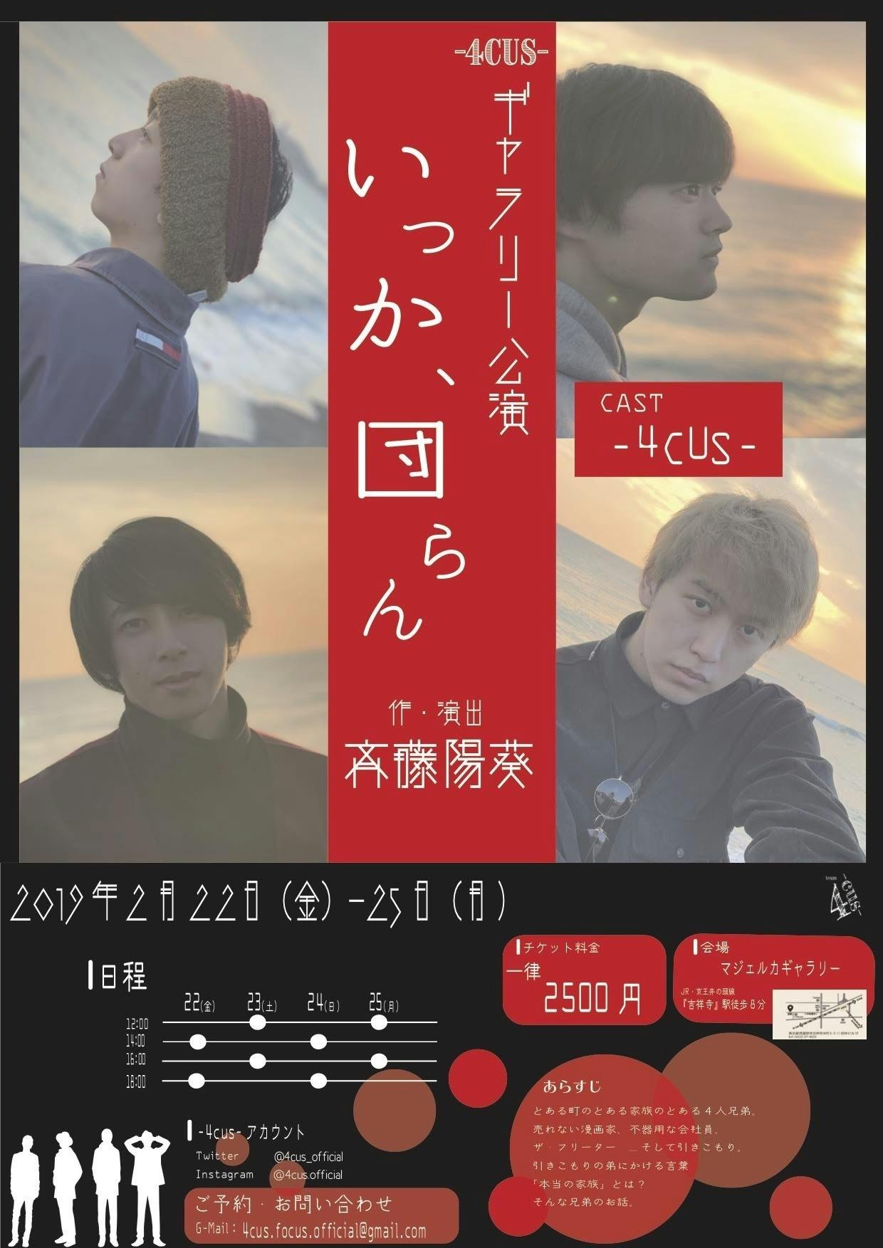 前作とは打って変わり家族をテーマとした物語。四人兄弟それぞれの個人的悩みを描きつつ、四兄弟の父親をめぐる共通の問題を乗り越えていく過程、絆を描いた。内面的問題を前面に出しながらコメディの要素を忘れず、四兄弟の仲の良さも垣間見える作品。ギャラリーという空間を子供部屋に見立て、観客が入り込みやすい空間を演出。-4cus-メンバーのみで役者を務めたため、メンバー4人の役を通した自己紹介のような作品になった。