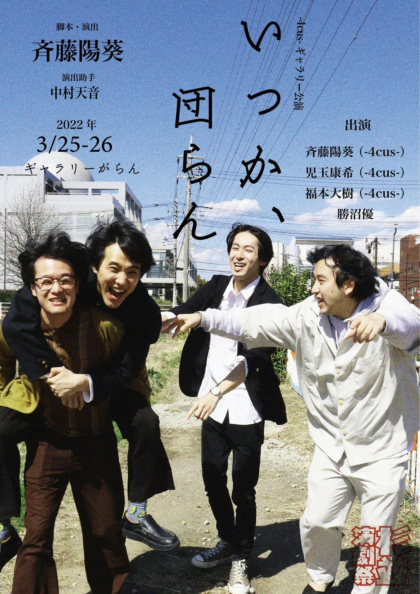 -4cus-初のコント公演となった。オムニバスにコントを上演し、幕間の映像やオープニングの映像をこだわって作った作品。どのコントも評判がよく、短い時間での笑いの詰め込み方や時間の使い方を学んだ作品となった。
