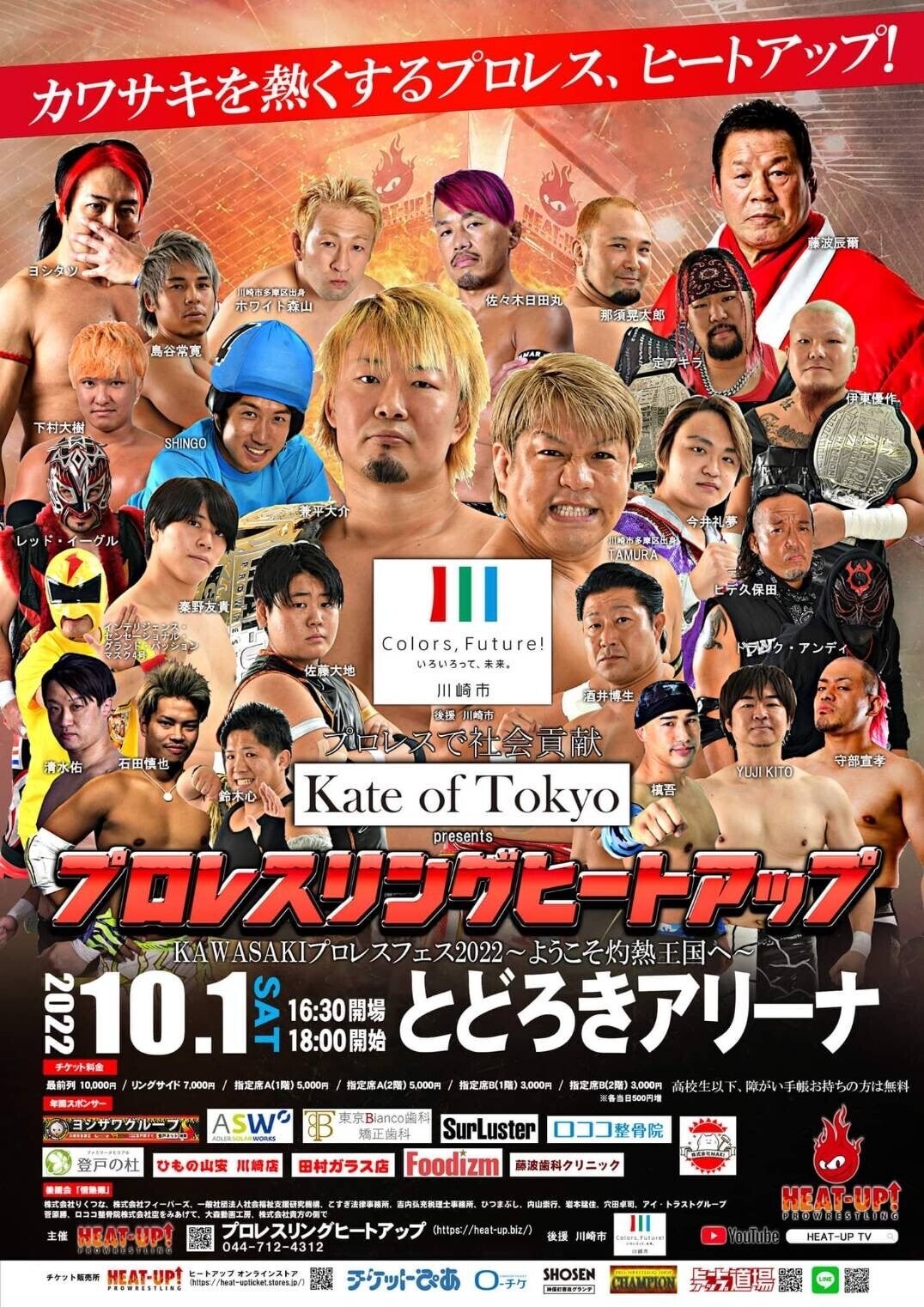 【川崎】"プロレスで社会貢献"地域と共に盛り上がるお祭りプロレスを開催したい!へのご支援誠に有難うございます。ご支援頂きました皆さんからの熱い気持ちを胸に「Kate of Tokyo presents KAWASAKI プロレスフェス~ようこそ灼熱王国へ」を成功させます。チケットをご希望された方への発送は完了しております。当日のご来場お待ちしております。ご支援バスタオル、DVD、ポートレート、お礼のお手紙、認定証は準備出来しだい発送させて頂きます。【Kate of Tokyo presents KAWASAKI プロレスフェス~ようこそ灼熱王国へ~】10月1日(土) 開場16:30/開始18:00会場:川崎・とどろきアリーナリングサイト(1階/2階) 7,000円指定席A (1階/2階) 5,000円指定席B (1階/2階) 3,000円https://heat-upticket.stores.jpプレイガイドチケットぴあ(Pコード:853035)http://ticket.pia.jp/pia/event.ds?eventCd=2223794ローチケ(Lコード:34954)https://l-tike.com/order/?gLcode=34954プロレスショップ チャンピオンhttp://champion-shop.jp書泉グランデhttps://www.shosen.co.jp/grande/闘道館https://www.toudoukan.com/s/■とどろきアリーナ大会特設ページ■第6試合ストレッチ店up/特別養護老人ホーム等々力 presentsHEAT-UPユニバーサル選手権試合シングルマッチ 60分1本勝負[王者]兼平大介 vs TAMURA[挑戦者]※王者兼平は4度目の防衛戦。第5試合株式会社グローズバル presentsHEAT-UPユニバーサルタッグ選手権試合タッグマッチ 60分1本勝負 [王者]定アキラ&伊東優作 vs ヨシタツ&今井礼夢[挑戦者]※王者定組は2度目の防衛戦。第4試合有限会社 クリオホーム presentsスペシャルシングルマッチ~甦るUの魂~シングルマッチ 60分1本勝負ホワイト森山 vs 佐々木日田丸第3試合登戸の杜 presents年の差55~飛龍伝承、受け継がれる炎~6人タッグマッチ 30分1本勝負藤波辰爾&長井満也&LEONA vs 酒井博生&秦野友貴&佐藤大地※ヒートアップJr.ルール採用第2試合ポルトガル国交記念試合~Welcome to Japan~4wayタッグマッチ 30分1本勝負TAJIRI&レッドイーグル vs 下村大樹&島谷常寛 vs ヒデ久保田&守部宣孝vs 槙吾&SHINGO 第1試合 有限会社 小川水道 presentsKAWASAKIプロレスフェス開幕!~ようこそ灼熱王国へ~タッグマッチ 20分1本勝負木高イサミ&プリンス・カワサキ vs 石田慎也&イナダマンダークマッチHEAT-UP版準レギュランブル2022~目指せ準レギュラー~バトルロイヤル 30分《出場選手》YUJI KITO 、那須晃太郎、鈴木心、清水佑、最上九、ジ・インテリジェンス・センセーショナル・グランドパッションマスク4号、ジ・オーソドックスNo.1、ジ・オーソドックスNo.2、ドランク・アンディ、マドレーヌ、伊藤薫、YAKO