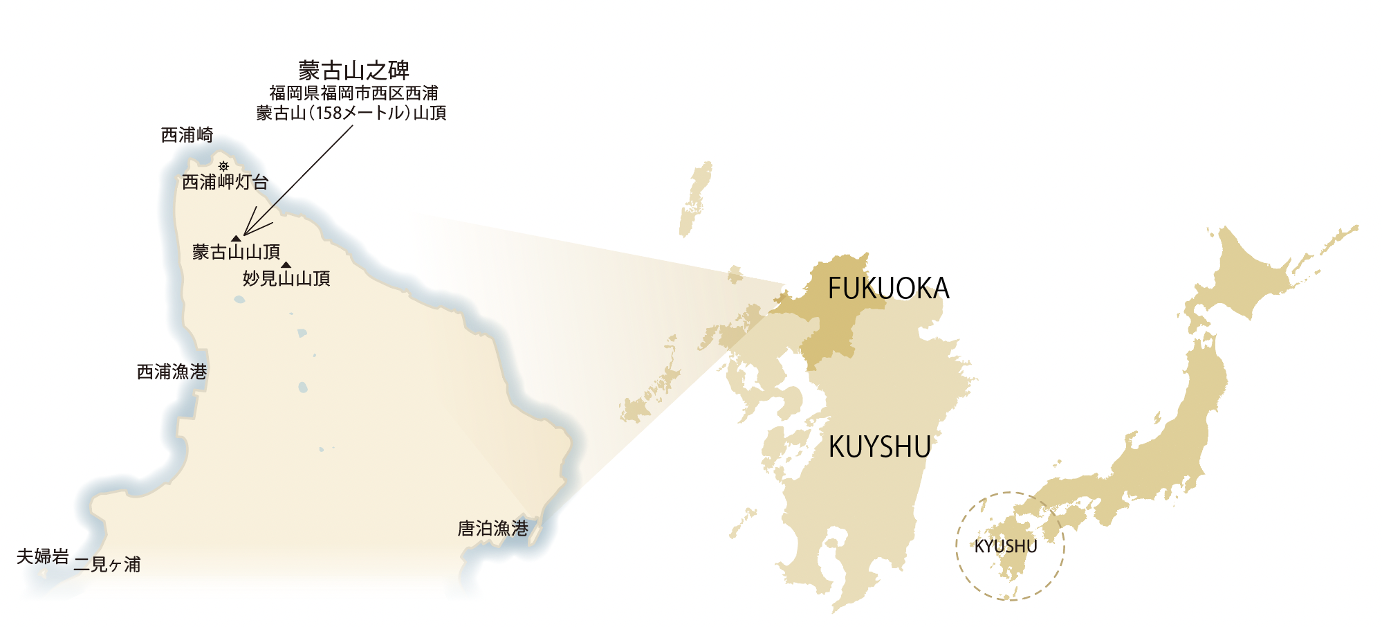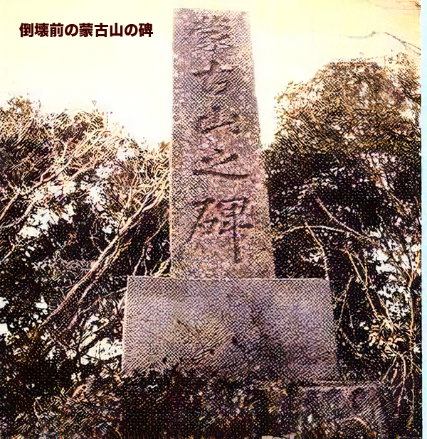 蒙古⼭(標⾼158㍍)⼭頂に建てられたこ記念碑「蒙古⼭之碑」が2005年の福岡県⻄⽅沖地震で倒壊したままになっていす。