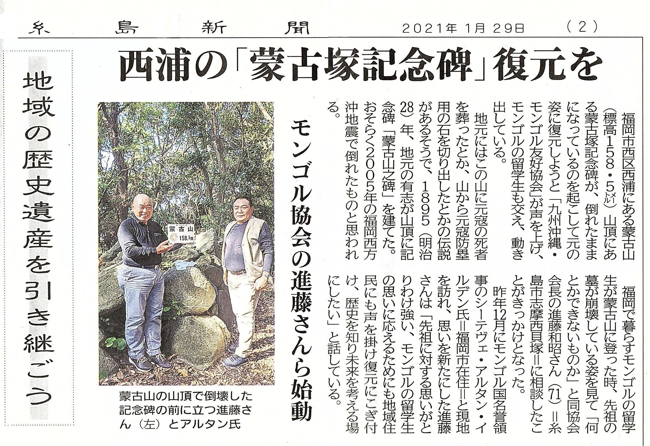 モンゴル・日本外交関係樹立50周年記念事業の一環といたしまして、当協会では在福岡モンゴル国名誉領事館を連携して「蒙古山之碑」復興の事業計画を進めております。
