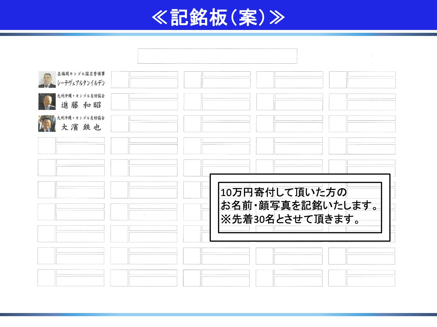 過去の歴史を通して、平和の⼤切さを学び合い、各国の国⺠がお互いに⽀え合える友好関係を築いていきたい。そのきっかけとして蒙古⼭の⽯碑復興計画の活動の輪に多くの⽀援者が参加してくださることを願っております。