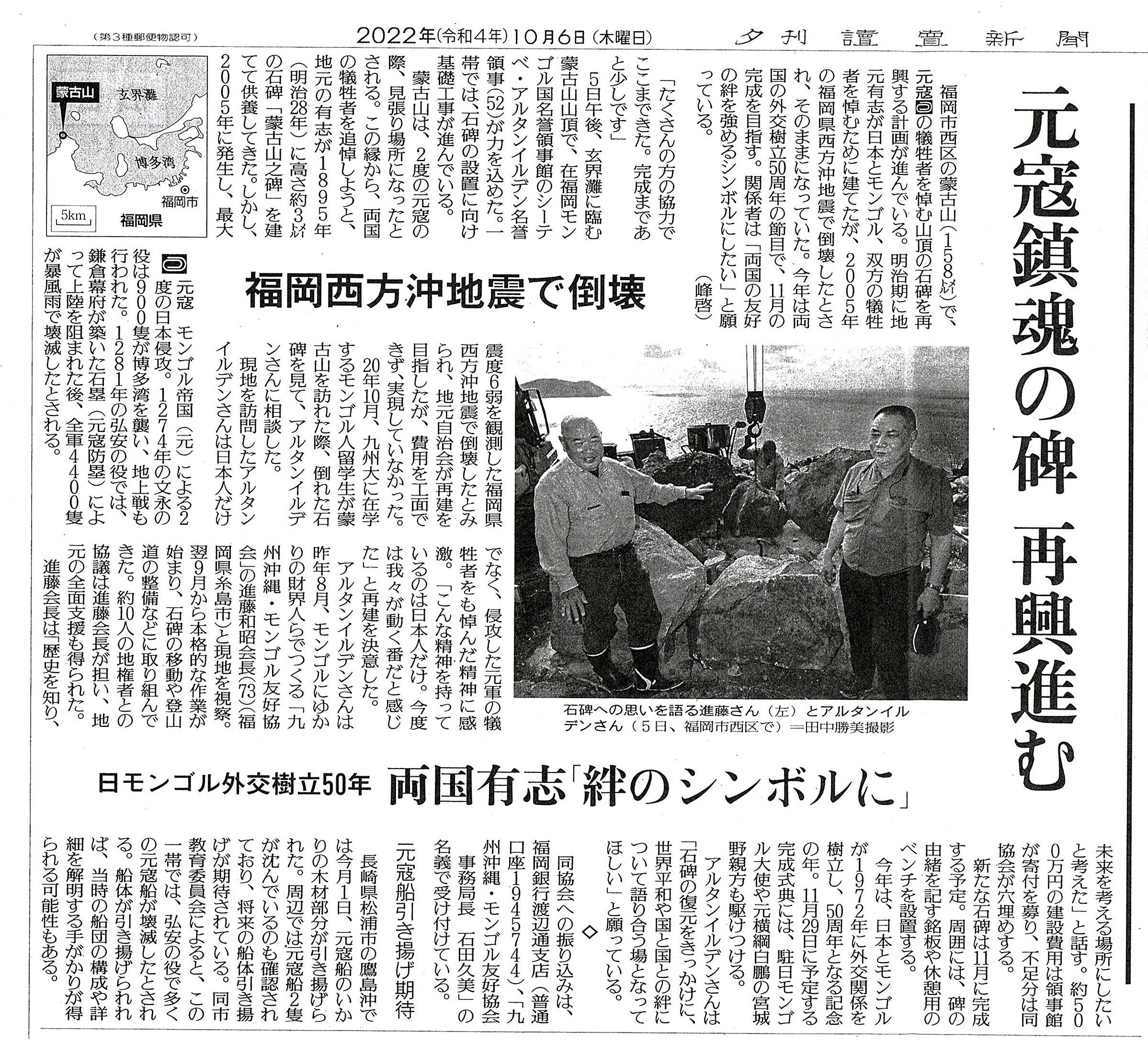 2022/10/13 13:37蒙古山之碑 復興プロジェクトについて2022年10月 6日(木)の読売新聞に掲載されました。 もっと見る