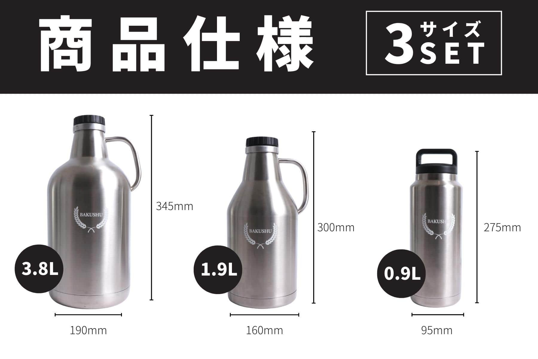 水筒サイズの0.9Lから、たっぷり飲み物が入る3.8Lまで、用途によってサイズをお選びください(小さめのサイズなら女性でも簡単に片手で扱えます)。