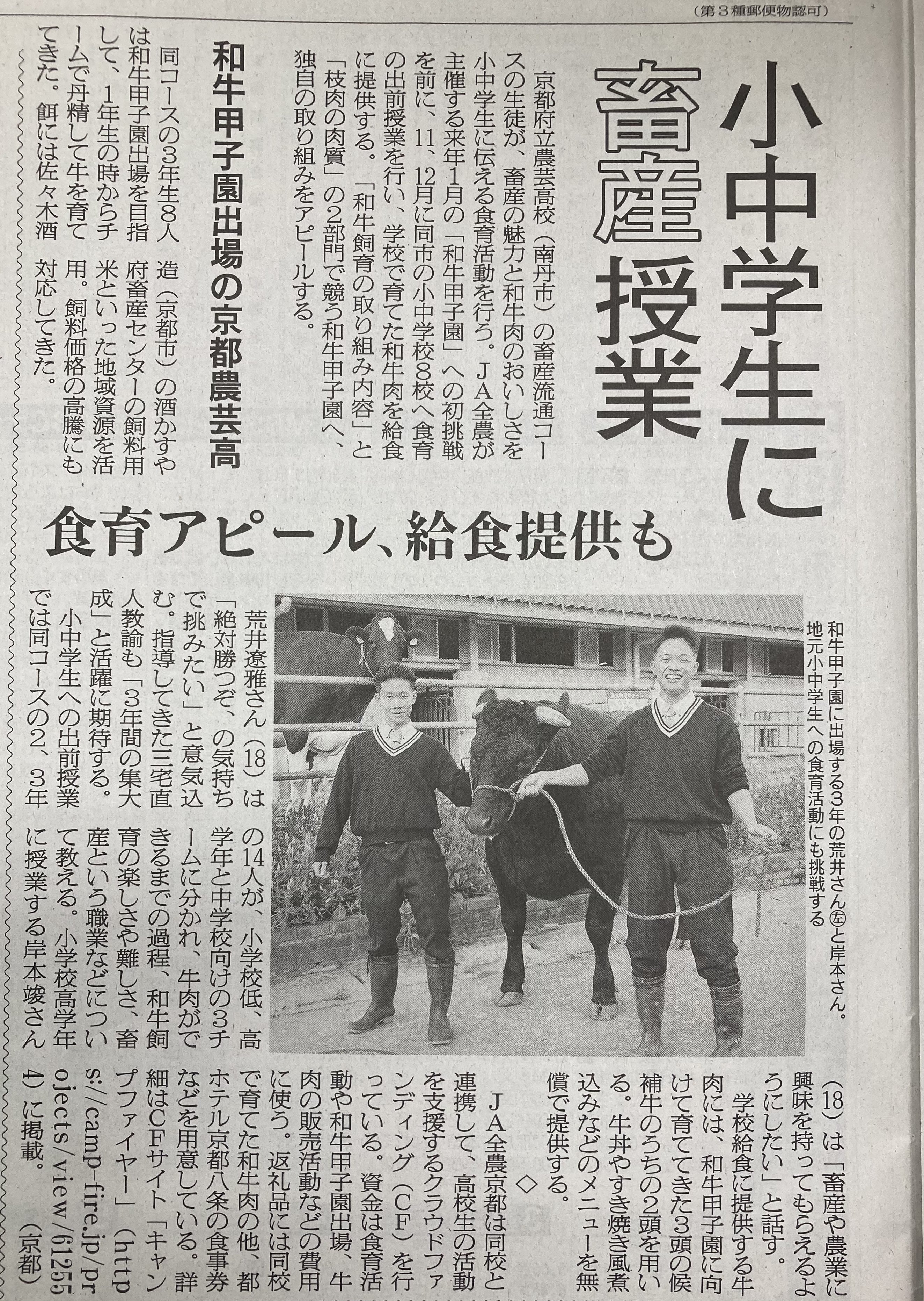 10月21日付の日本農業新聞(近畿・北陸版)に、食育活動と本CFの記事を掲載していただきました!