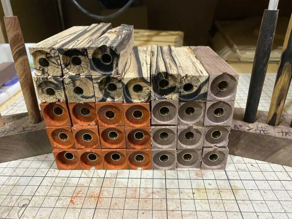 寸法に切り出した四角柱(ブランクと言ったりします)の中心に竪穴を開けます。ここに替え芯などが入るわけです。
