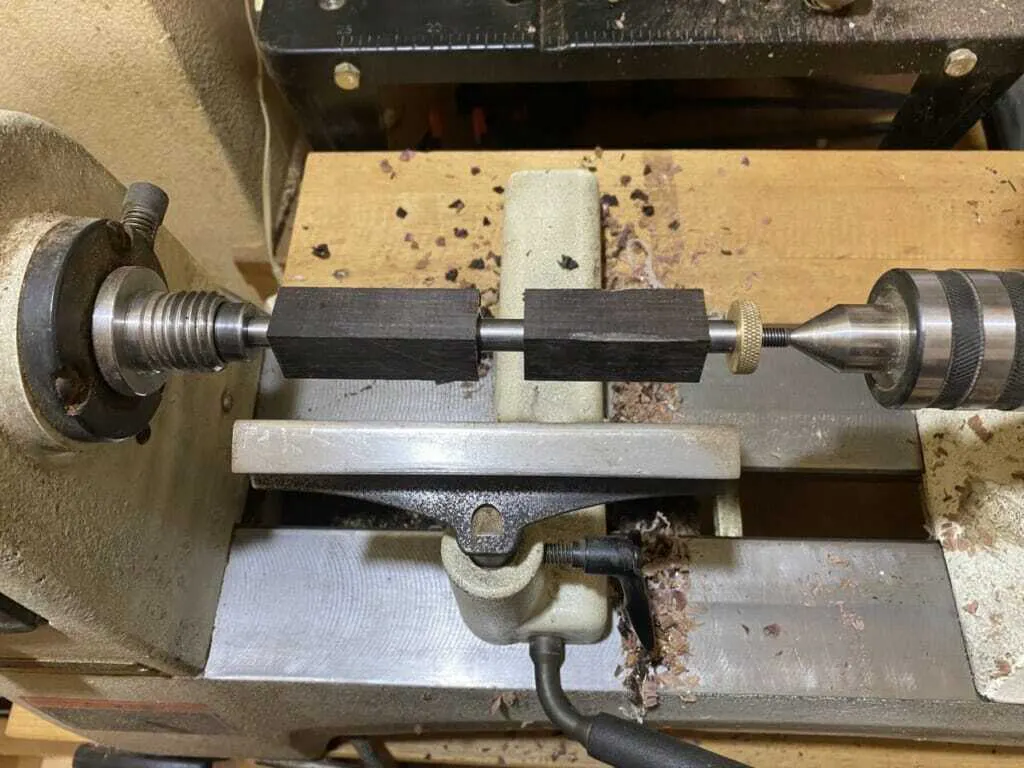 旋盤にブランクを取り付けるためにペンマンドレルという器具を使います。 ブランクに開けた穴を利用して固定します。