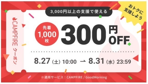 先着1000名様限定CAMPFIREでご使用いただけるクーポンです。