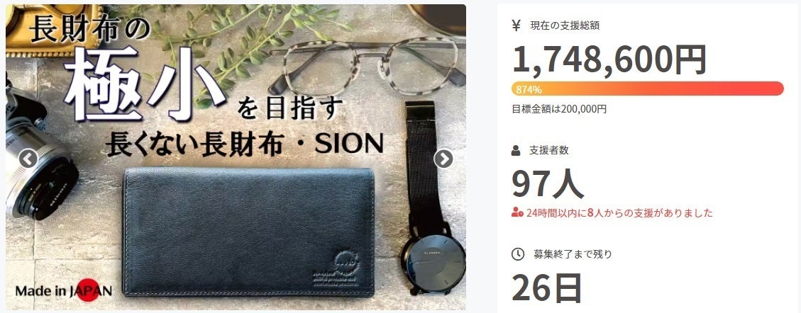 ご覧いただきましてありがとうございます。本プロジェクトが850%超えを達成し、900%目前となっております。応援購入いただきました皆さま、ありがとうございます!プロジェクトページや活動報告で何度もお伝えしておりますが、【SION】で使用しておりますゴートレザー(山羊革)は、植物タンニン鞣しで仕上げられておりエイジングをお楽しみいただけます。特に私はしっとりとした質感が気に入っております。しなやかで丈夫でありながら軽量という利点だらけの素材です。『弊社が使用しております牛革は、全て食肉用に消費された際の「副次的産物」です。無駄なく、大切な資源として使用しております。』素材だけでなく独自設計により快適にご使用いただける仕様となっております。詳細は、プロジェクトページにてご覧ください。https://camp-fire.jp/projects/view/612639おひとりでも多くの方にこの秀逸な極小長財布【SION】をお届けしたい!この想いを持ち続け最後まで、頑張ってまいります。自信を持ってオススメします。お得にご購入いただけるこの機会をお見逃しなくご購入いただけましたら幸いです。ご検討中の方がいらっしゃいましたら、どうぞよろしくお願いいたします。「日本の伝統技法」と「現代の技術」が融合 【長くない長財布・SION(シオン)】https://camp-fire.jp/projects/view/612639株式会社スタジオYクリエイション代表 吉川信和