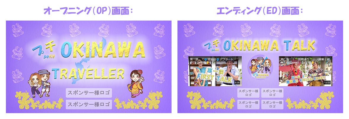 あなたの会社やお店のロゴを番組オープニング(OP)+エンディング(ED)の両方に掲載し、また、動画説明文にもお店・企業紹介(40文字以内)、連絡先やリンクを貼らせて頂きます(10月配信分一ヶ月間、動画計4本のOP+ED計8回、一回当たりOP5秒前後~ED10秒前後)