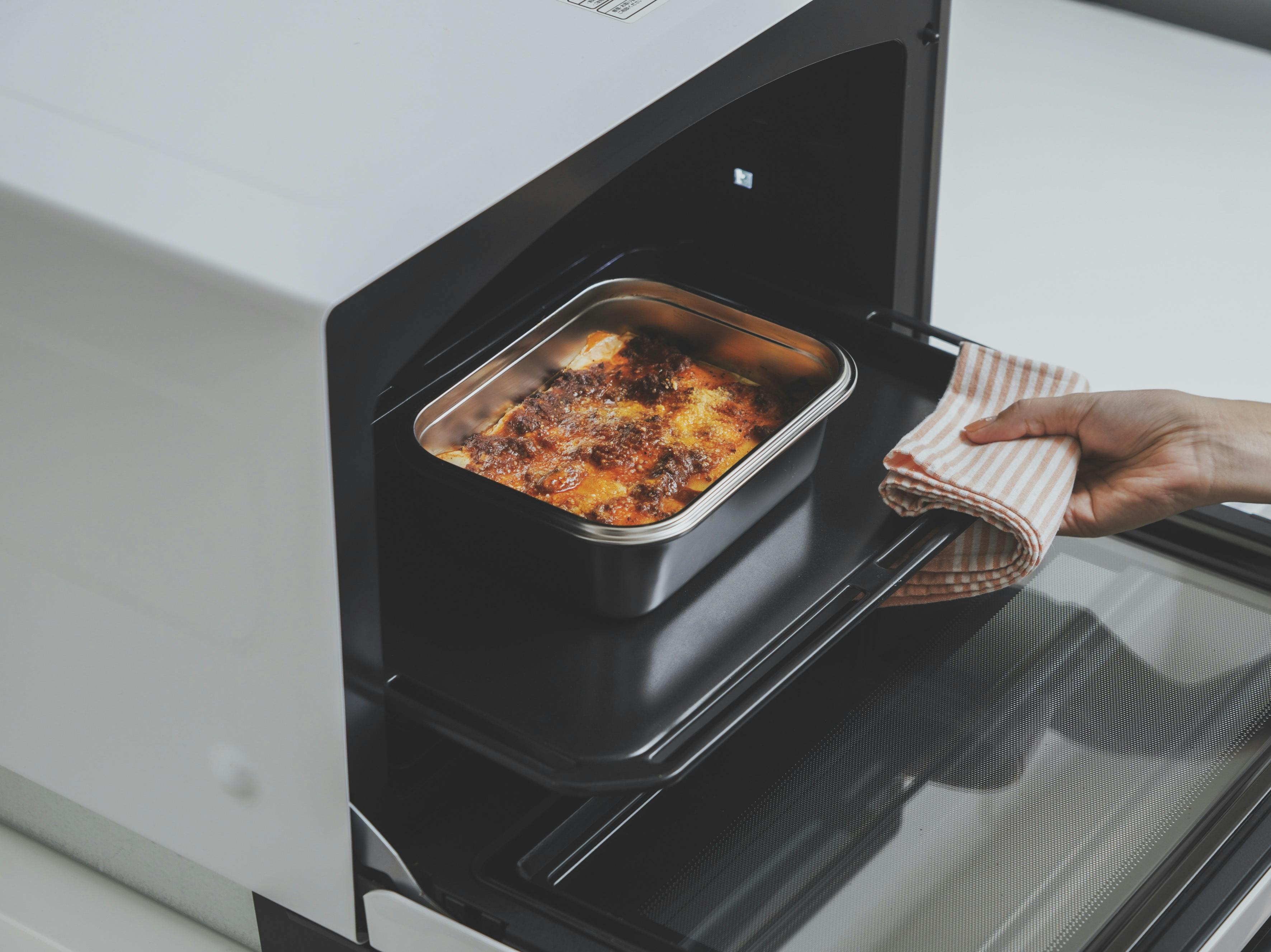 大人数のパーティでラザニアやケーキをオーブンで作って、そのままテーブルへ。家族の人数や、用途に合わせて3サイズの中から選べるのも便利です。