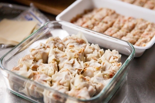 ④手で裂き、キャニスターに残った蒸し汁をよくからめる。