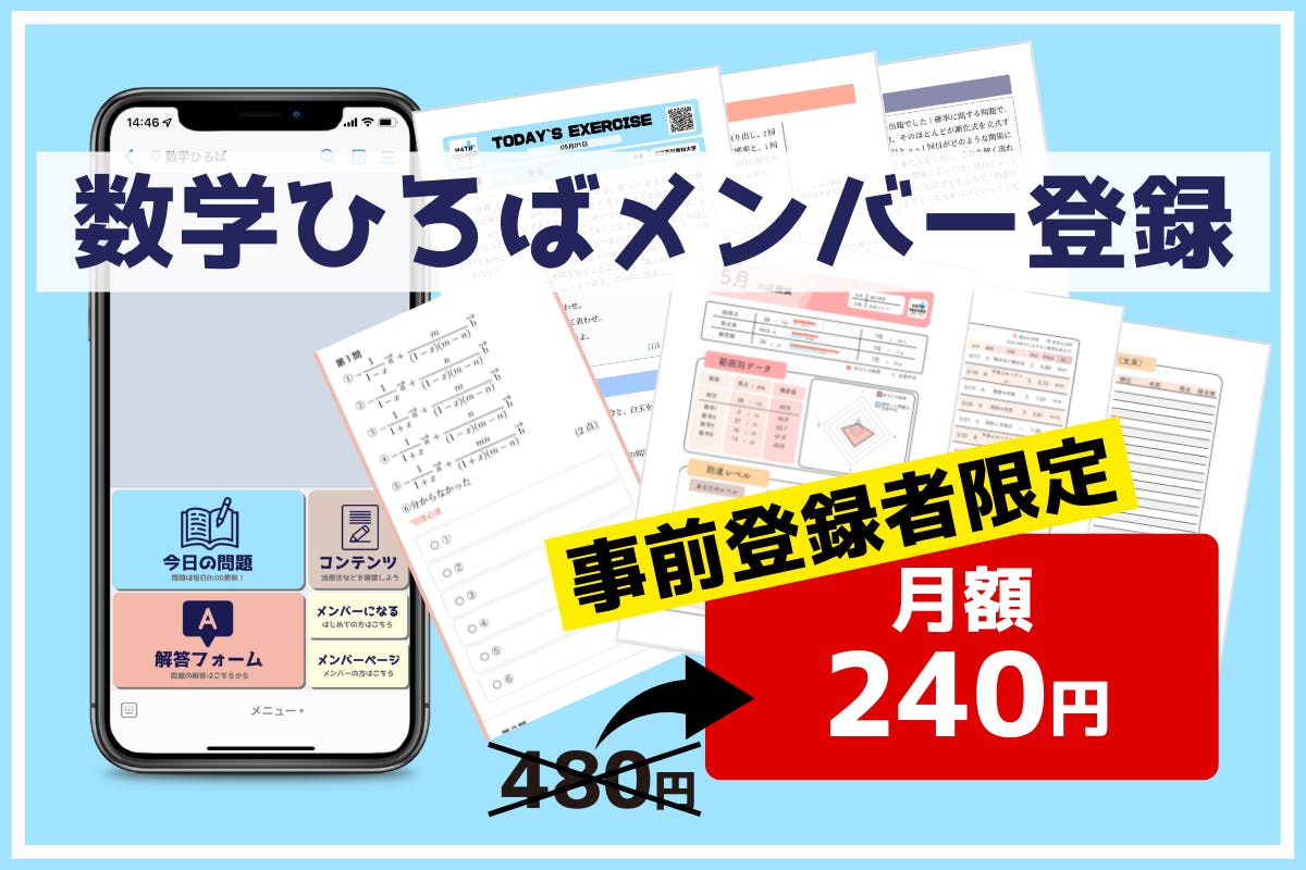 8月31日までに事前メンバー登録をお済ませいただくと、2023年3月までの間、数学ひろばを通常の半額となる月額240円でご利用いただけます。