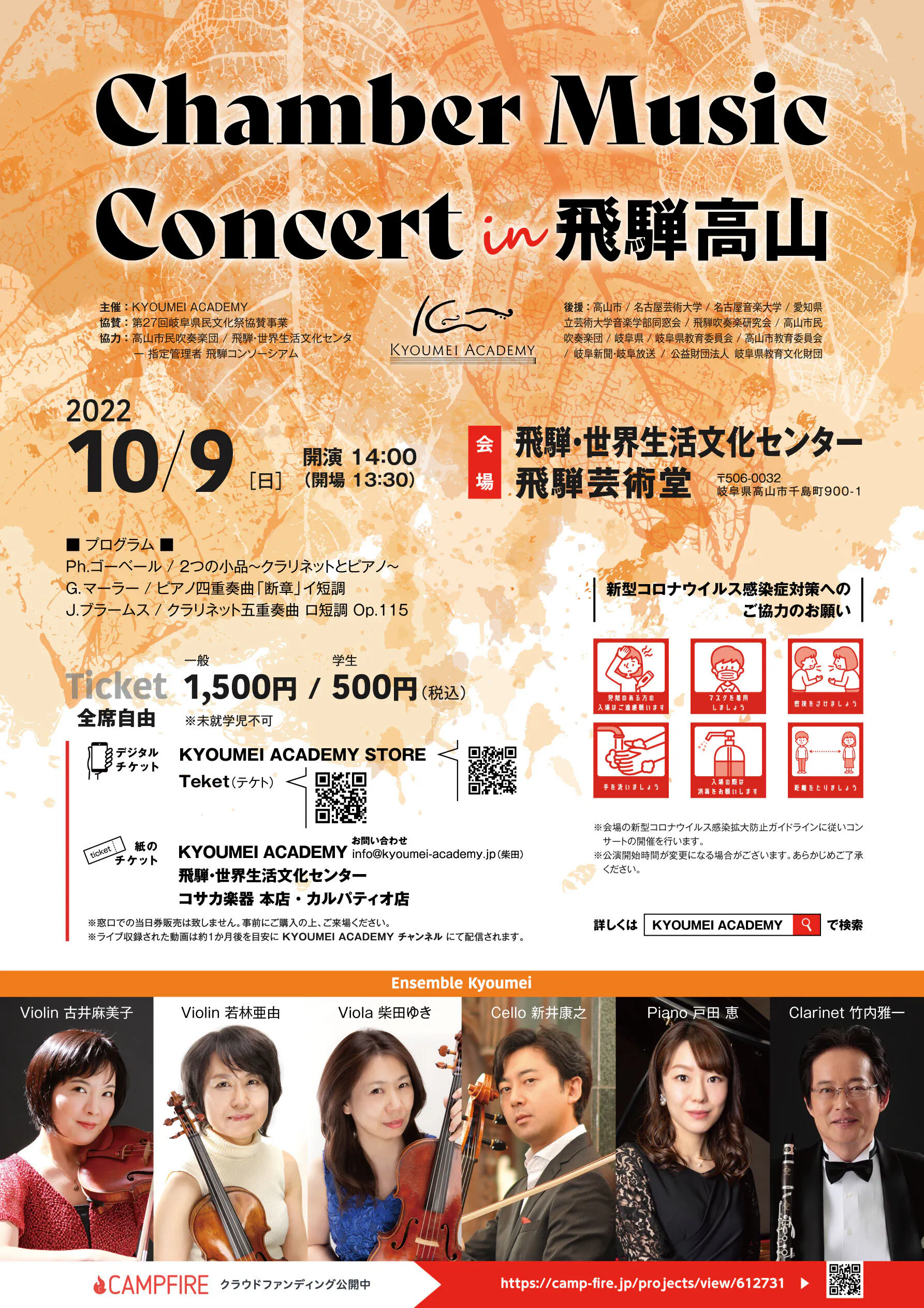 私たちは2022年10月9日に岐阜県高山市にある飛騨・世界生活文化センター・飛騨芸術堂で室内楽のコンサートを計画しています。そのコンサートに地域の中高生100名を無料招待したいと考えています。