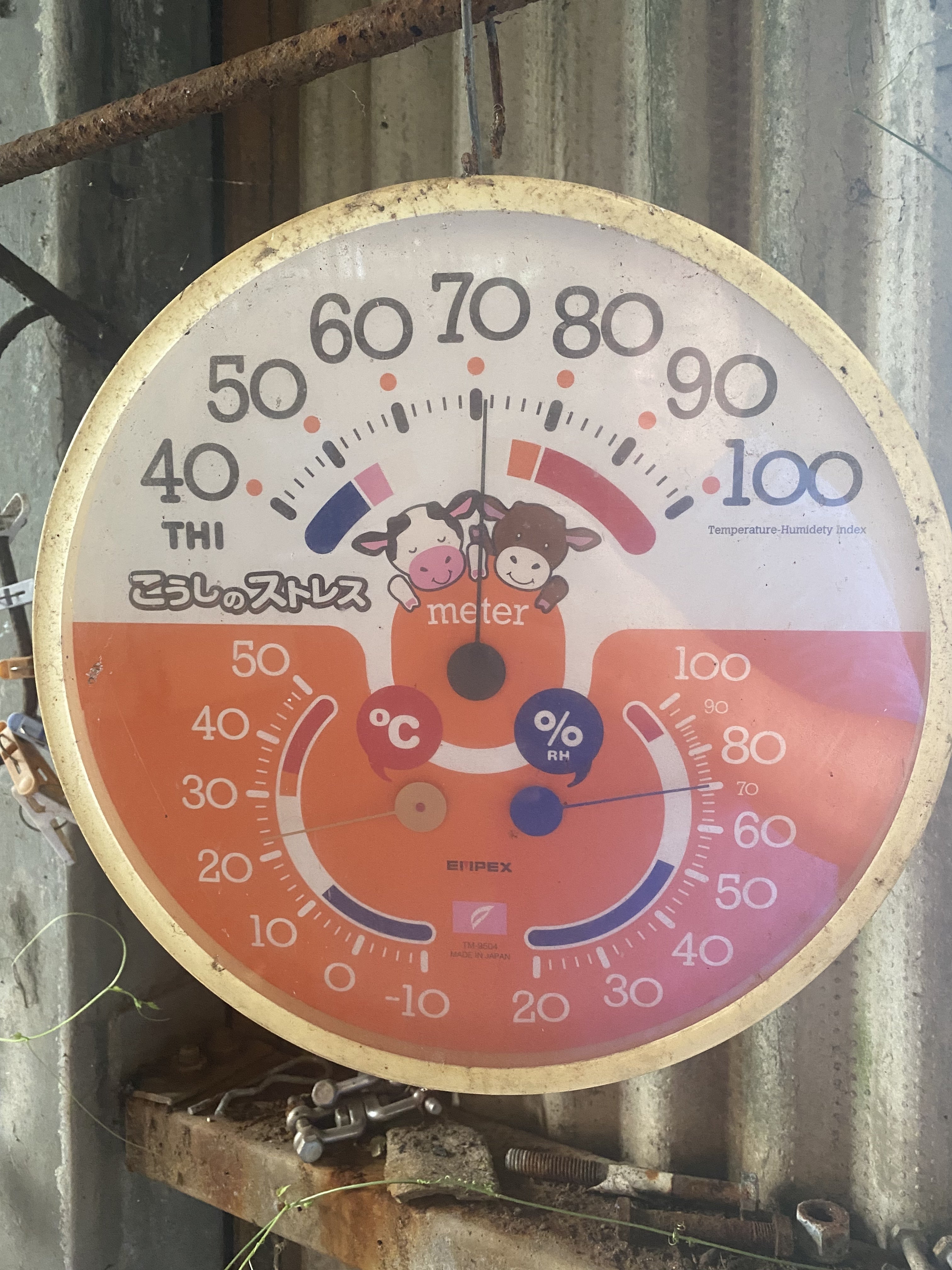 こんにちは今日はウチの牛舎の設備を一つご紹介しようと思います。それは宮崎県の畜産試験場が開発した「こうしのストレスメーター」です!人間も暑いと疲れたり寒いと風邪をひいたり温度の影響を受けると思いますが、実は和牛も同じく温度や湿度の影響を受けます。産まれたばかりの子牛は体温調整が苦手で冬場では死んでしまう事もあるくらい寒さに弱いです。又、三か月以降の牛は、おなかの中で粗飼料(牧草)を常に発酵させ続けているので発酵熱がお腹から発生している状態ですから湯たんぽを抱えながら生きているような状態なので寒さには強くなりますが、今度は暑さに弱くなります。暑いと食欲が低下したり受胎できなくなってしまったり、さらに暑さがひどければ熱中症になってしまったり・・・死んでしまう事もあるのです。これは、私たち人間にとってもそうですがストレスは大敵です!私たちは子牛や母牛のストレス対策は病気予防や体調管理に重要と考えています。そしてお肉になるてんぷ牛がストレスを感じて生きる事=お肉が固くなったり味わいが悪くなると考えていますので、この温湿度から牛の感じるストレスを割り出してくれて一目でわかるメーターを設置して、寒すぎる時はヒーターで温めたり、暑過ぎる時は扇風機のブンブン回して彼らがなるべく快適に暮らせるようにサポートしています。ウシは大型でダイナミックですが繊細なところもあるんですよね。意外でしたか?