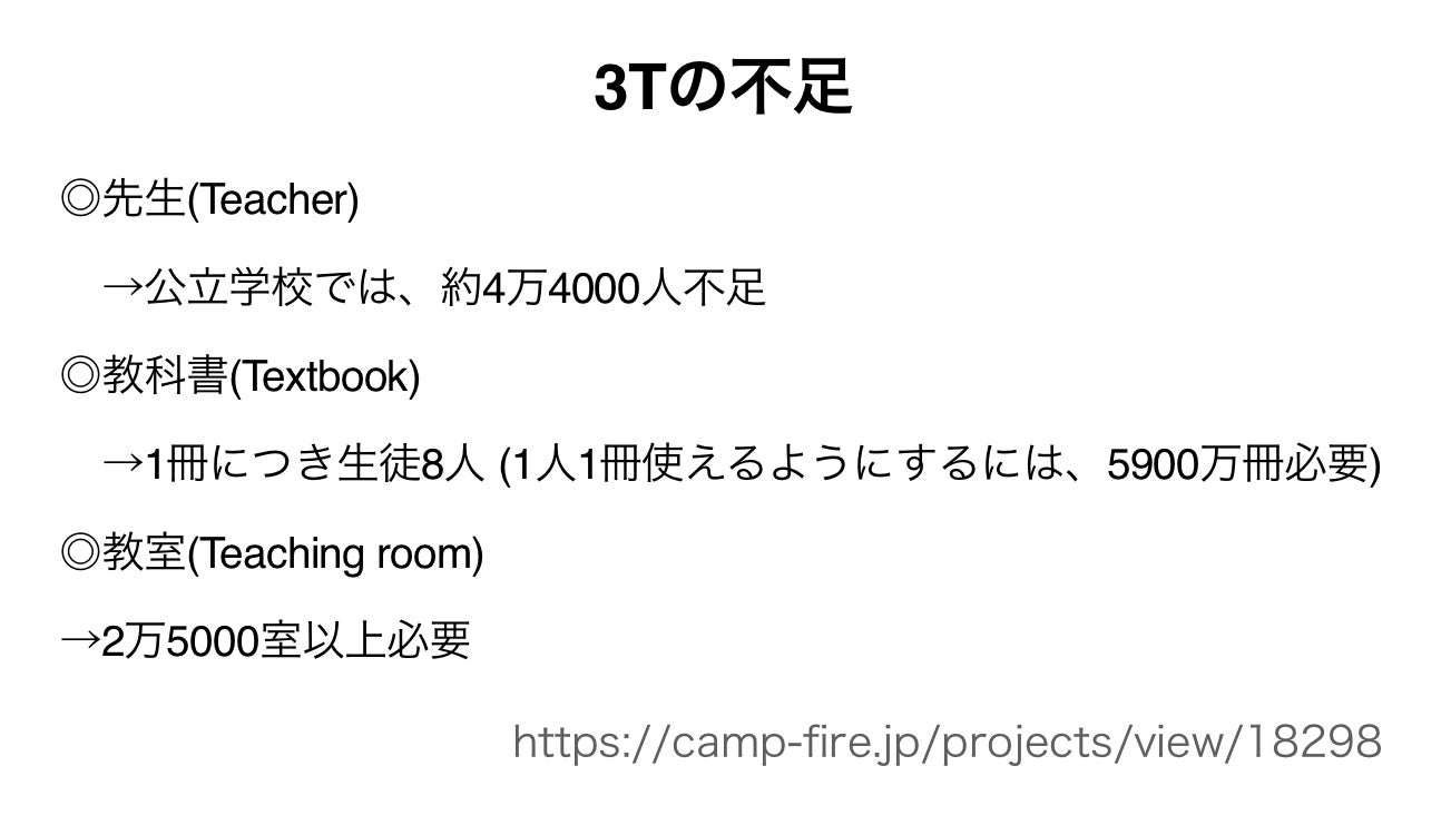 現在のフィリピンでは、先生(Teacher)、教科書(Textbook)、教室(Teachingroom)の3Tが不足しています。