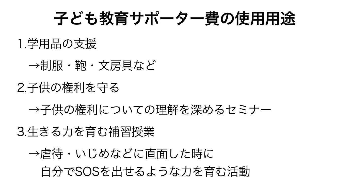 寄付金額 : 18万200円 (子ども教育サポーター費 : 1万8000円×10人、給食費 : 200円)