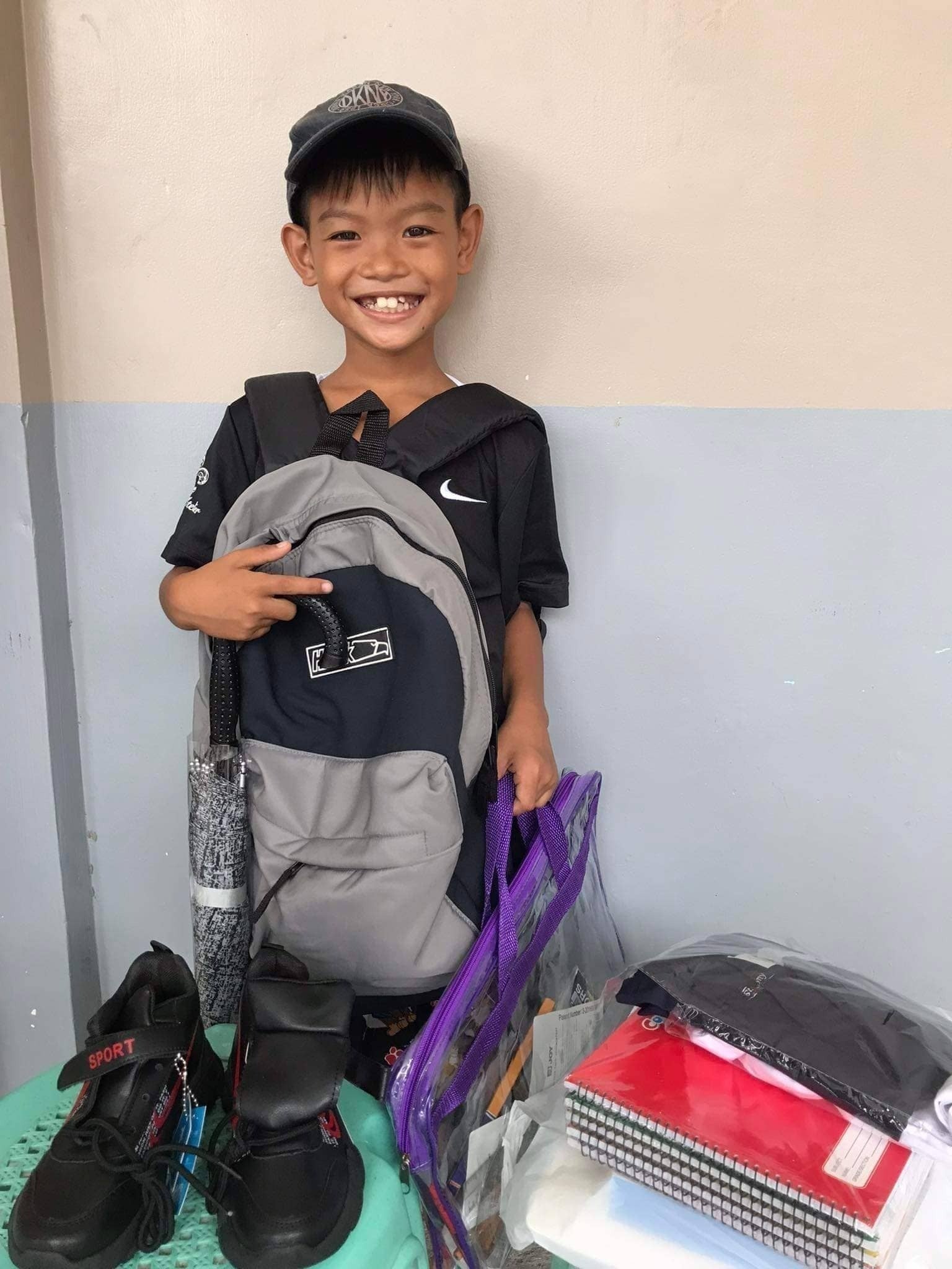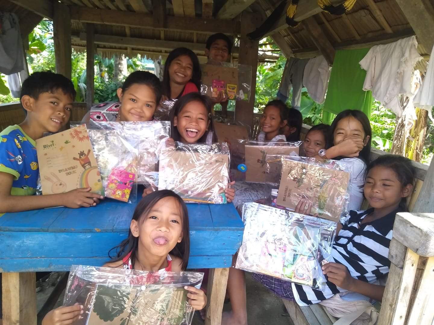 ↑新品の文房具セットを受け取って大喜びの子どもたち(コロナ前に撮影)