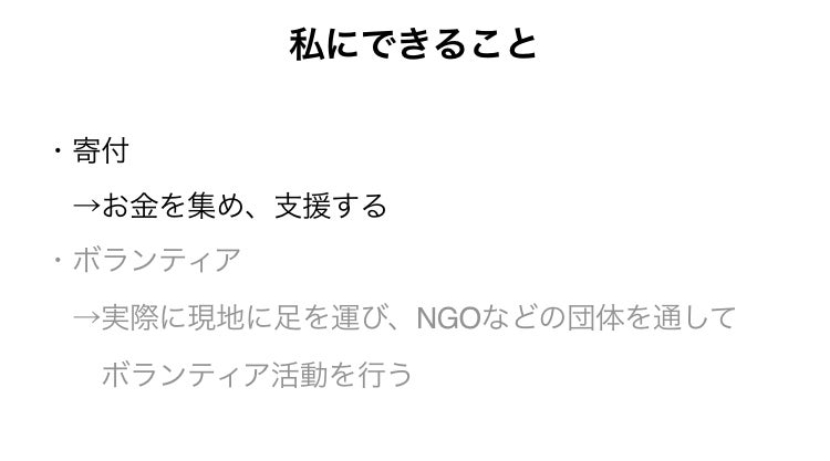 そこで、高校生の私にも出来ることはないか考えてみると、ボランティアと寄付の2つを思いつきました。