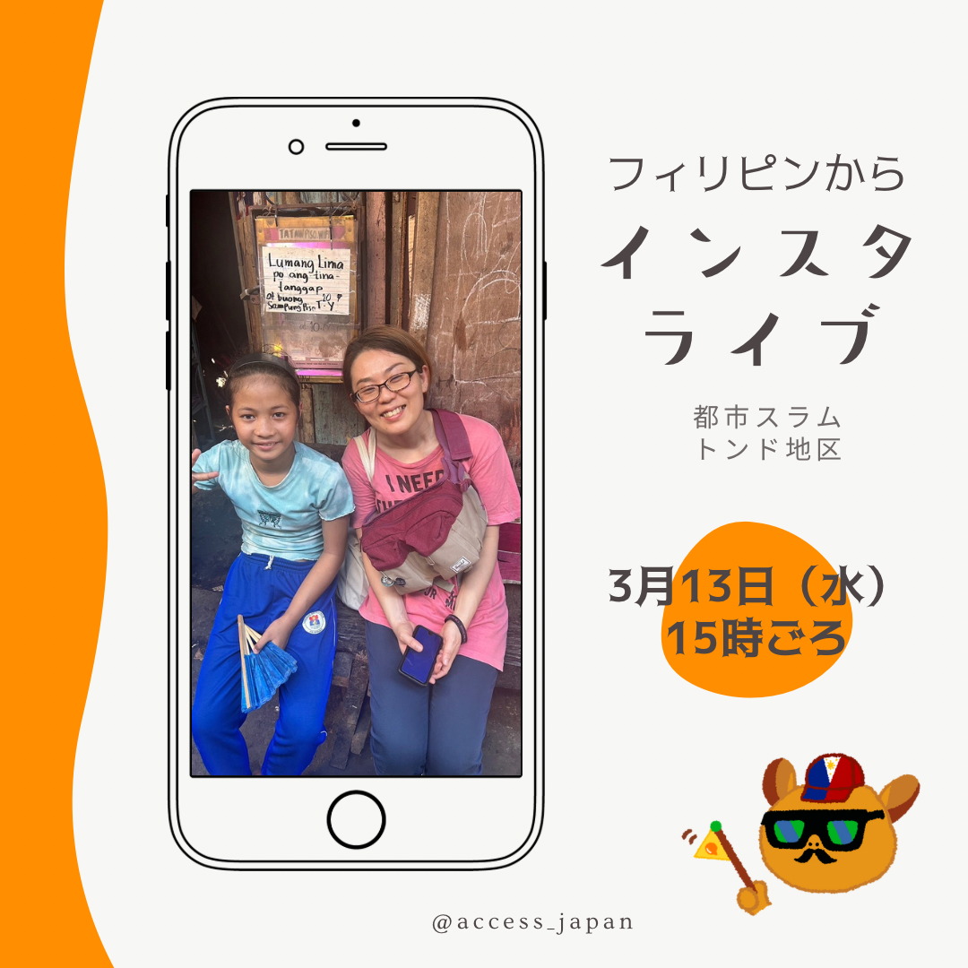 2024/03/13 09:05突然ですが!本日3月13日(水)の15時ごろより、理事長の野田さよがフィリピンかrかインスタライブを開催します!どんどん発展していくフィリピンの中で、今も厳しい環境におかれている都市スラム・トンド地区。現地スタッフとともに、り生中継でお伝えします。ぜひアクセスのインスタ @access_japan からご視聴ください♪(リアルタイム視聴ができない方も、アーカイブが残りますのでぜひチェックしてくださいね。)** こちらもご覧ください! ***【35年の成果を未来につなぐ】マンスリーサポーター募集キャンペーン実施中‼︎https://access-jp.org/access2024 もっと見る