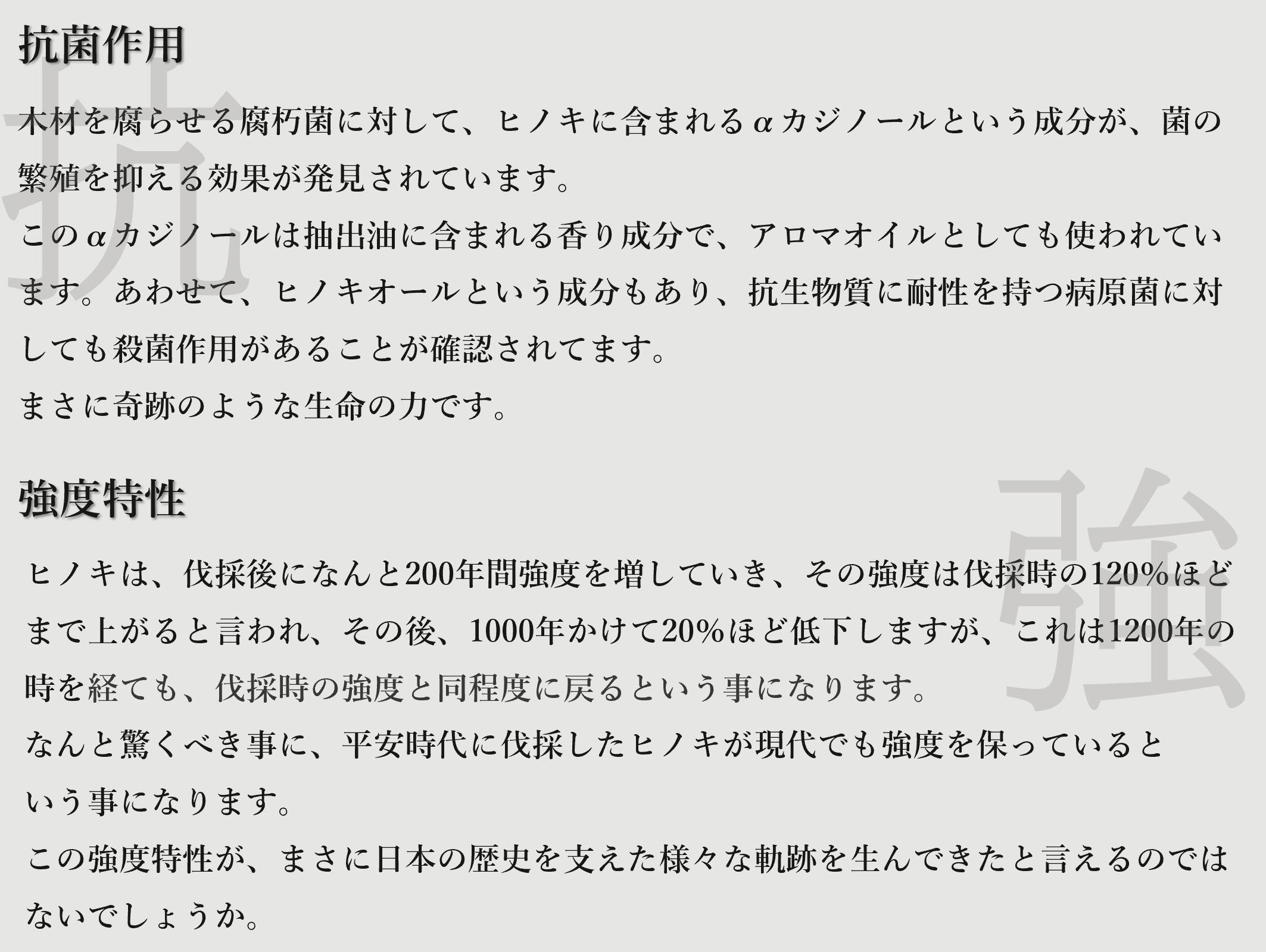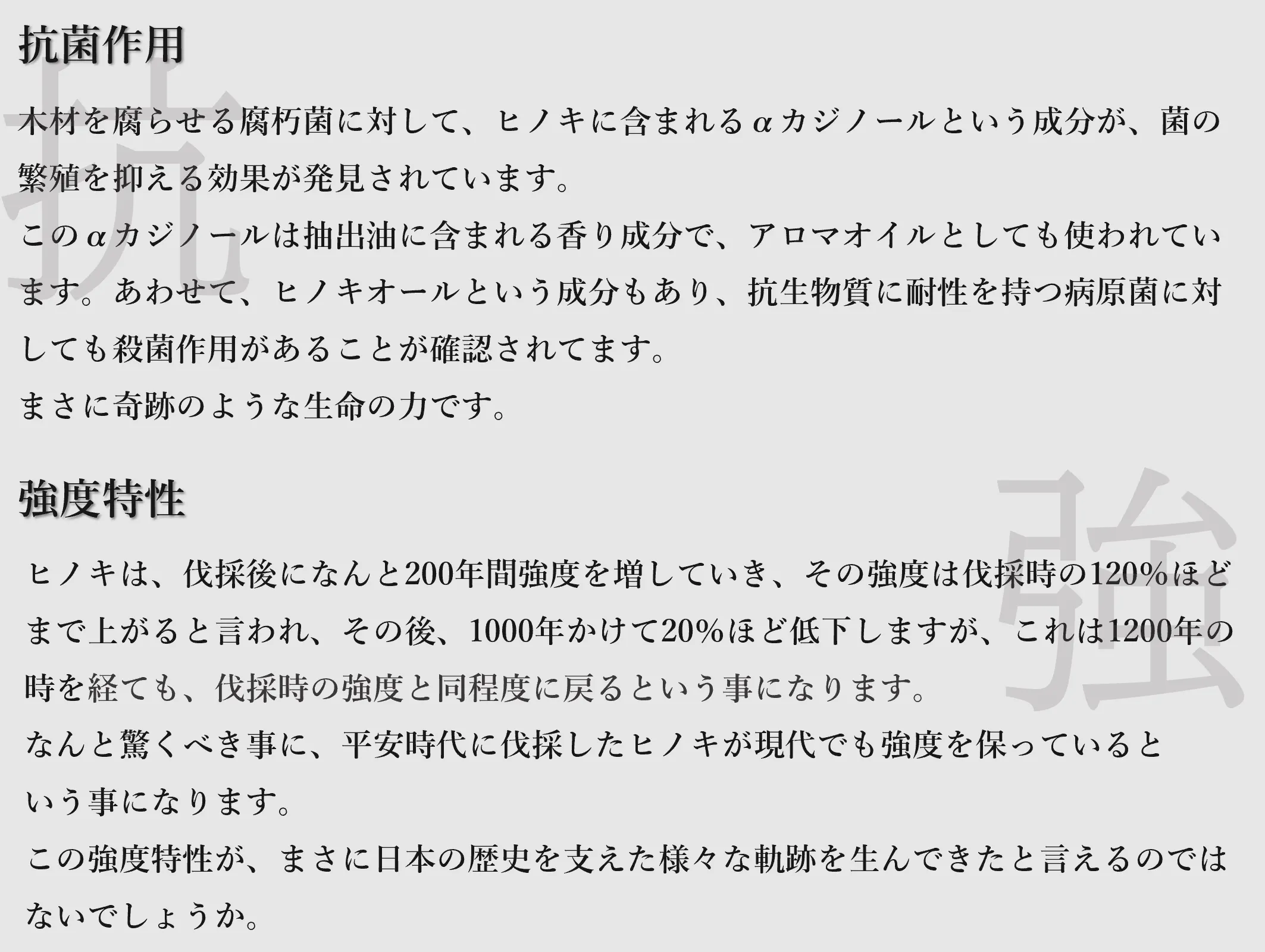 檜(ヒノキ)は、その心地よい香りや、強度から寺院仏閣などの建築物にも多く使われてきました。それは、古代日本人の知恵と工夫が生み出したものですが、ヒノキに含まれる成分による効果が大きく関係しています。科学的な根拠は現代になって解明されていますが、昔から人が「心」で感じるものには、特別な力があるのでしょう。また、伐採後も香りを発散し続け、この香りは、脳の活動と自立神経活動を鎮静化し、リラックスした気持ちをもたらせてくれます。