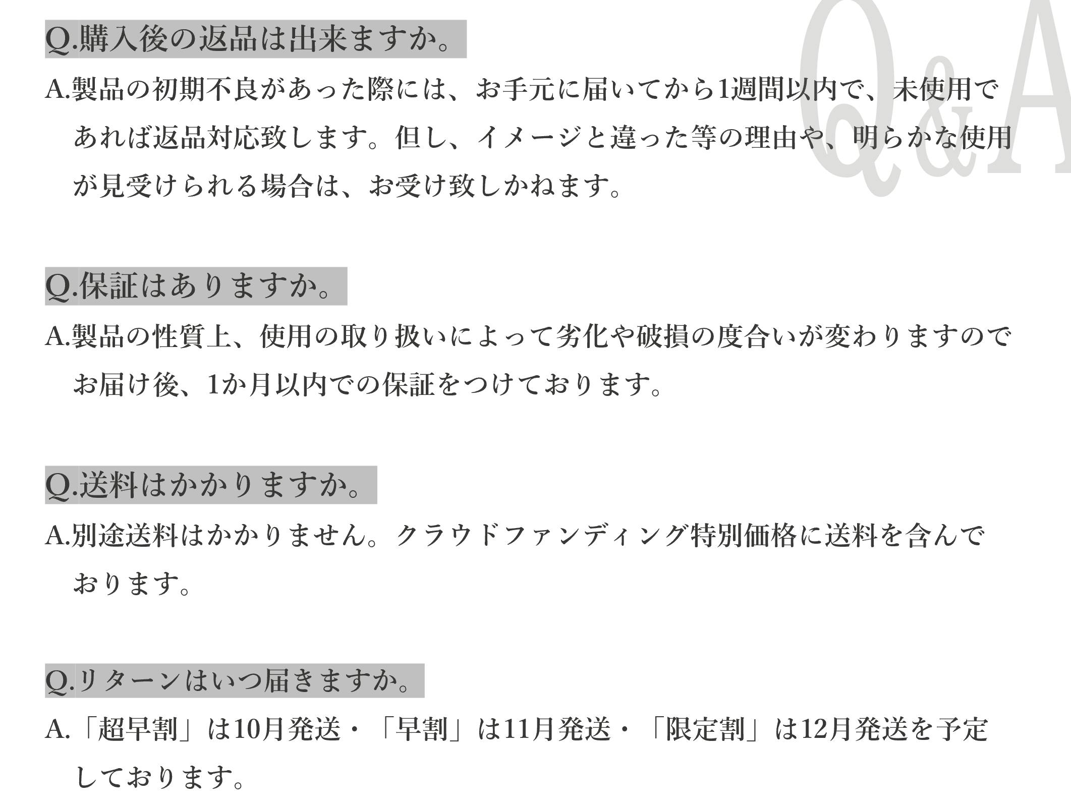 ・ご支援数が想定を上回った場合、製造工程の都合上、製品の出荷時期が遅れる可能性がございます。